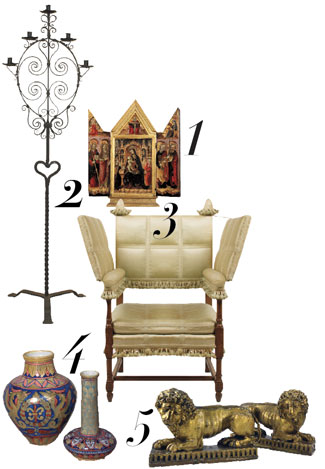 A symbol of power and majesty since ancient Egyptian times, the lion was a popular motif during the Renaissance. This carved 18th-century giltwood duo still retains its original overlay. $8,800, Patrick Bavasi, 172 E. 61st St., NYC, 212-796-4986, patrickbavasi.com.