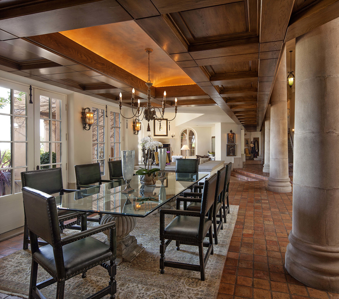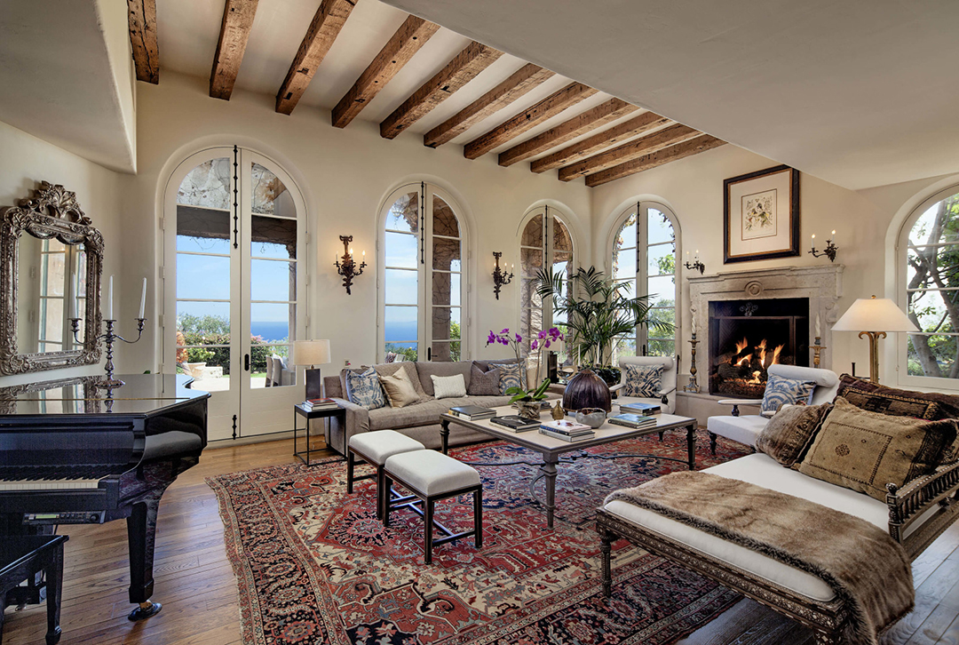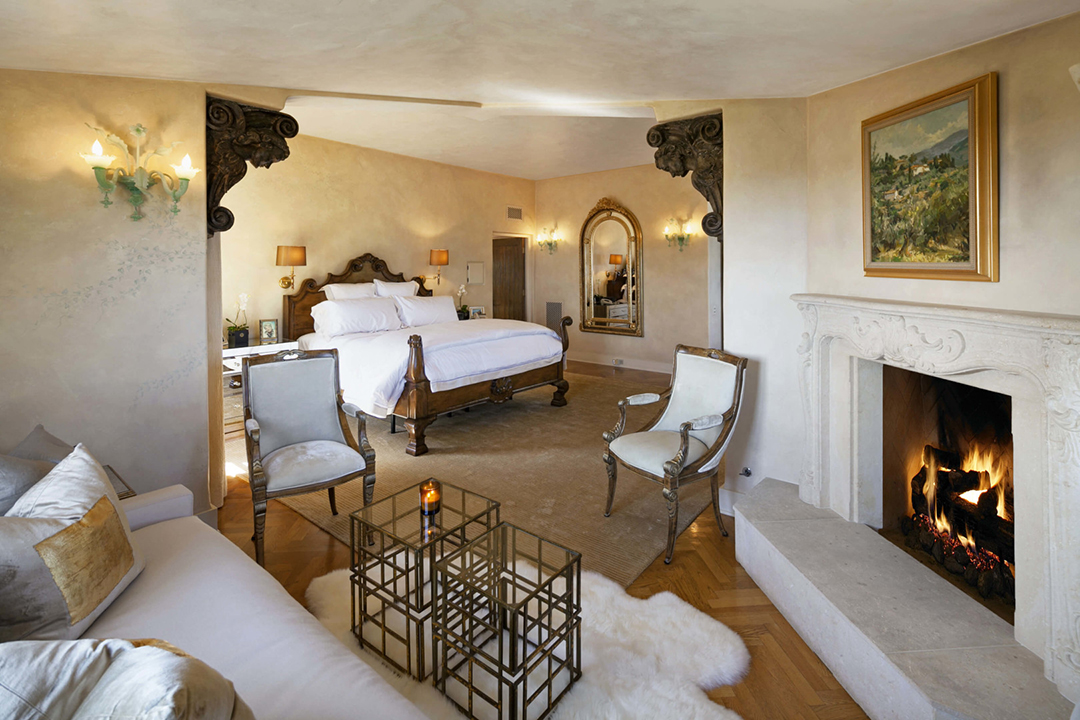 Called Villa Santa Lucia, the house was designed by noted Santa Barbara architect Barry Berkus and echoes the architectural style of Tuscany’s famous hilltop villages. Stone columns, bridge beam ceilings, oak floors and arch-top French doors add to the old world elegance. The first level is accessed by a double-height entry hall, which leads to the spacious living and dining areas. Beyond the entertaining spaces lie a grand eat-in family kitchen and a study that leads to a secret hedged garden. The second level houses the master suite along with 3 additional guest suites, while the top floor is occupied by a unique Tower room that could serve as a study or meditation retreat.