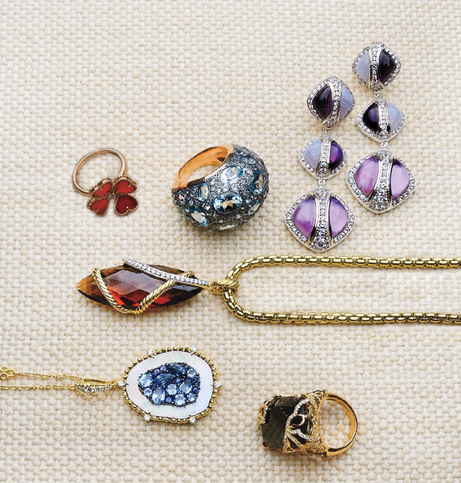 All That Glitters (clockwise from top left) Van Cleef & Arpels Effeuillage charm ring with carnelian in 18k pink gold, $4,550, at London Jewelers, 2 Main St., East Hampton, 631-329-3939, vancleefarpels.com, londonjewelers.com. Pomellato Tabou dome ring in blue topaz and 18k yellow gold, $4,175, at London Jewelers, 47 Main St., Southampton, 631-287-4499, pomellato.com, londonjewelers.com. Kara Ross Gemstone Collection Deco triple-drop earrings in sterling silver, amethyst, and agate, $1,940, at Greenwich Jewelers, 64 Trinity Pl., NYC, 212-964-7592, kararossny.com. David Yurman cable-wrap necklace and box chain in cinnamon quartz with pavé diamonds in 18k yellow gold, $6,100, at London Jewelers, 2 Main St., East Hampton, 631-329-3939, davidyurman.com, londonjewelers.com. Ivanka Trump lace scroll ring in 18k yellow gold with black onyx and diamonds, $4,965, at London Jewelers, 2 Main St., East Hampton, 631-329-3939, ivankatrump.com, londonjewelers.com. Oasis Nautica pendant in 18k yellow gold with diamonds, blue sapphires, blue quartz, and mother-of-pearl and 18k yellow gold and pavé diamond chain, $6,900, at Judith Ripka, 777 Madison Ave., NYC, 212-517-8200, judithripka.com.