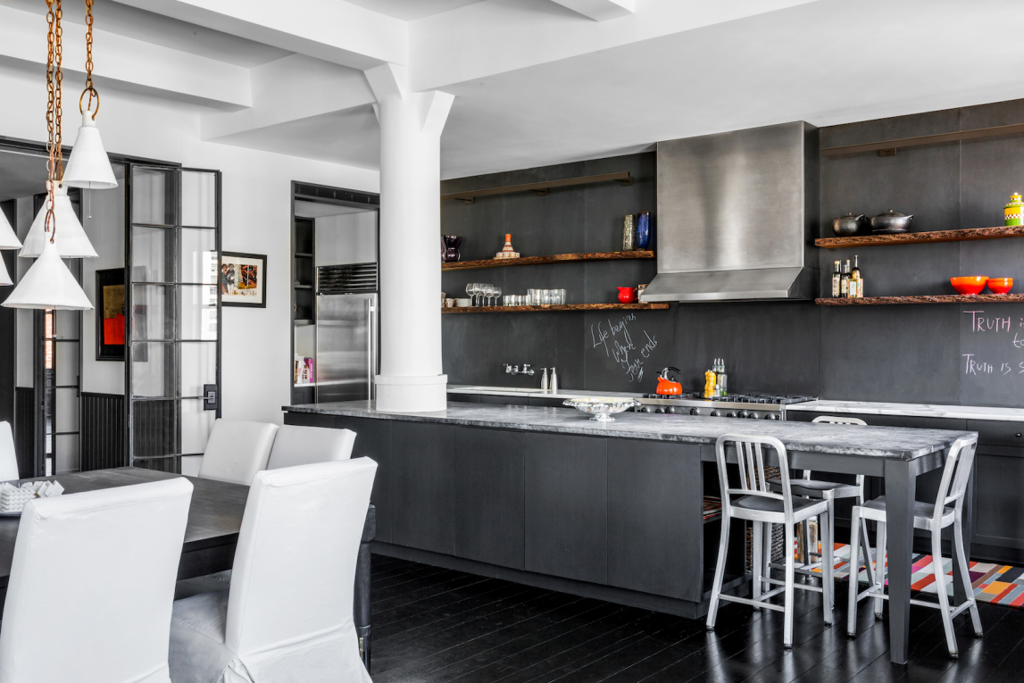There’s nothing funny about this Tribeca penthouse that just hit the market asking $20M, even if comedian Jon Stewart is its former owner. The 6,280-square-foot pad is glamorous through and through with ebony wood floors and crisp white walls that frame views of Tribeca through picture windows. The living room and dining room are open to one another and form a spacious great room that connects to the kitchen, where a chalkboard backsplash adds a playful touch. Upstairs, there is a casual family room and adjoining home office, which accesses a landscaped terrace. The second floor also houses the sprawling master suite and another staircase leads to the rooftop observation terrace, which the listing suggests would be the perfect perch for an urban farm.