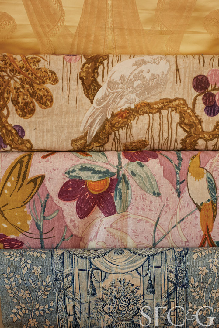 Taylor’s philosophy on choosing fabrics for her collection is simple but thoughtful—she looks for pieces that are “beautiful, unique and usually hand-made.” Drawers and shelves in the showroom are filled with treasures from Europe, Asia and Africa. A piece of Spitalfields silk-satin from late 18th-century London features brightly colored flowers exquisitely woven into a glowing, pearly background. A rich, red silk from late 17th-century France borrows colors and floral patterns from the Middle East and is woven through with gleaming gold thread. In an age of dim candlelight, Taylor notes, “designers were genius at maximizing the possibilities of light reflection.”
