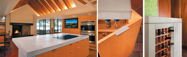 The homeowner, a Frank Lloyd Wright fan, wanted to emulate the famed architect’s use of reddish-brown concrete floors, and the result further warmed the interior. “Concrete has a connotation of cold and industrial but can be just the opposite,” explains Arelt.