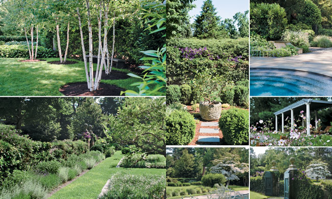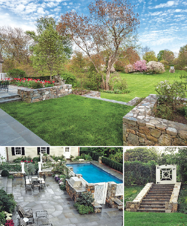 The landscape for this classic Westport home needed to pay homage to the surrounding neighborhood—old estates from the 1920s—while meeting the needs of new owners with three young children. It was left to Diane Devore, a registered Landscape Architect and principal of Devore Associates Landscape Architects, to deftly insert a series of working terraces leading from the house out into the surrounding landscape, much of which is classified as wetlands. The terraces are nestled along a valley at the center of the property. They do duty as grilling and seating areas, new pool and maze.