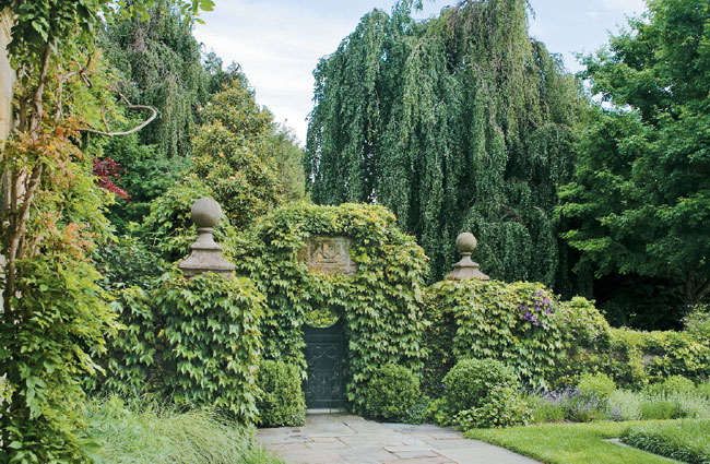 The look is timeless, yet these quiet, meditative walkways and garden rooms are the recent handiwork of Alice Cooke Design Associates, LLC. For Alice Cooke, private gardens are a living, abundant expression of their owners’ personal style—both a refuge and a sanctuary. Here, the homeowner was from California and wanted something herbal-based. “‘The client only wanted a couple of colors: pale pink, blue and white. And said: Please, no roses anywhere,’” notes Cooke.