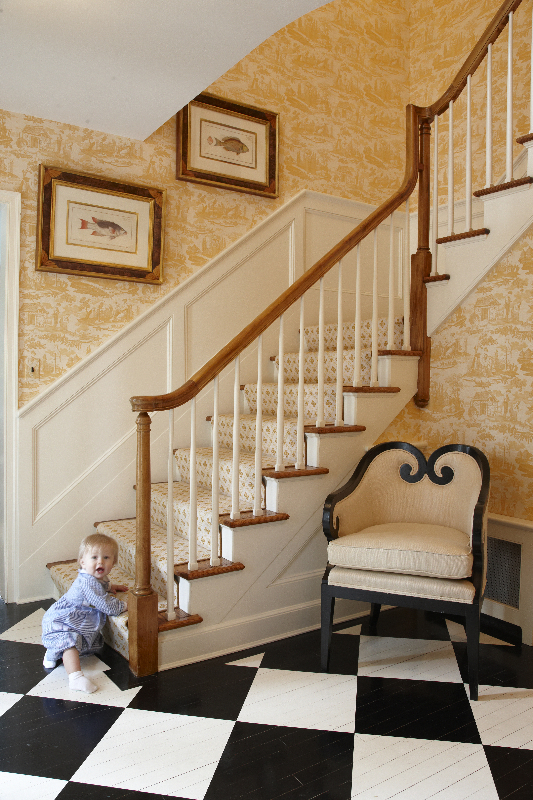 Keep life close at hand with chic storage. My favorite trick is an upholstered toy box in the living room…it looks like a part of the fabric scheme, but hides a Hot Wheels roller derby beneath! This one from George Smith can come in any size, I love the corners.