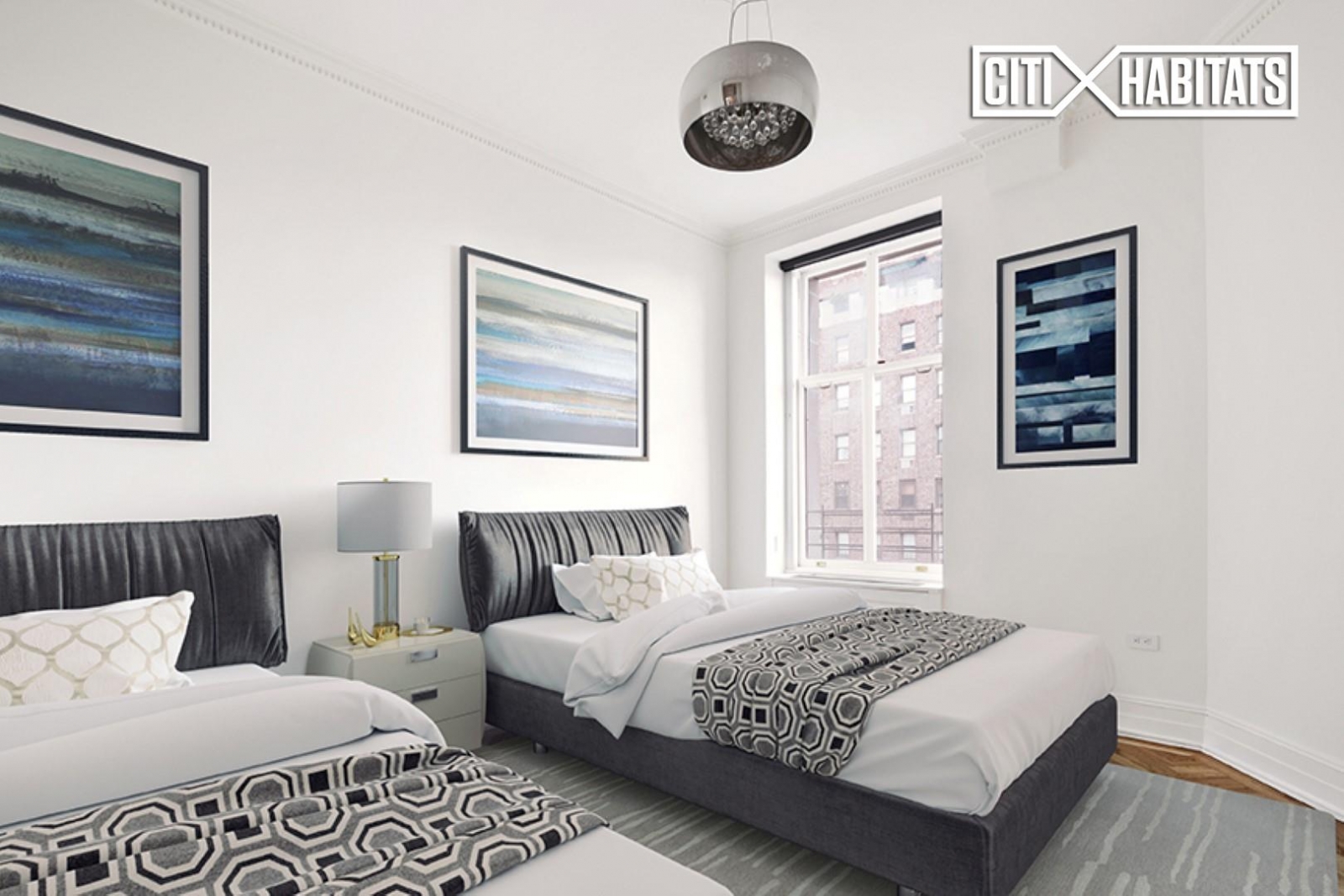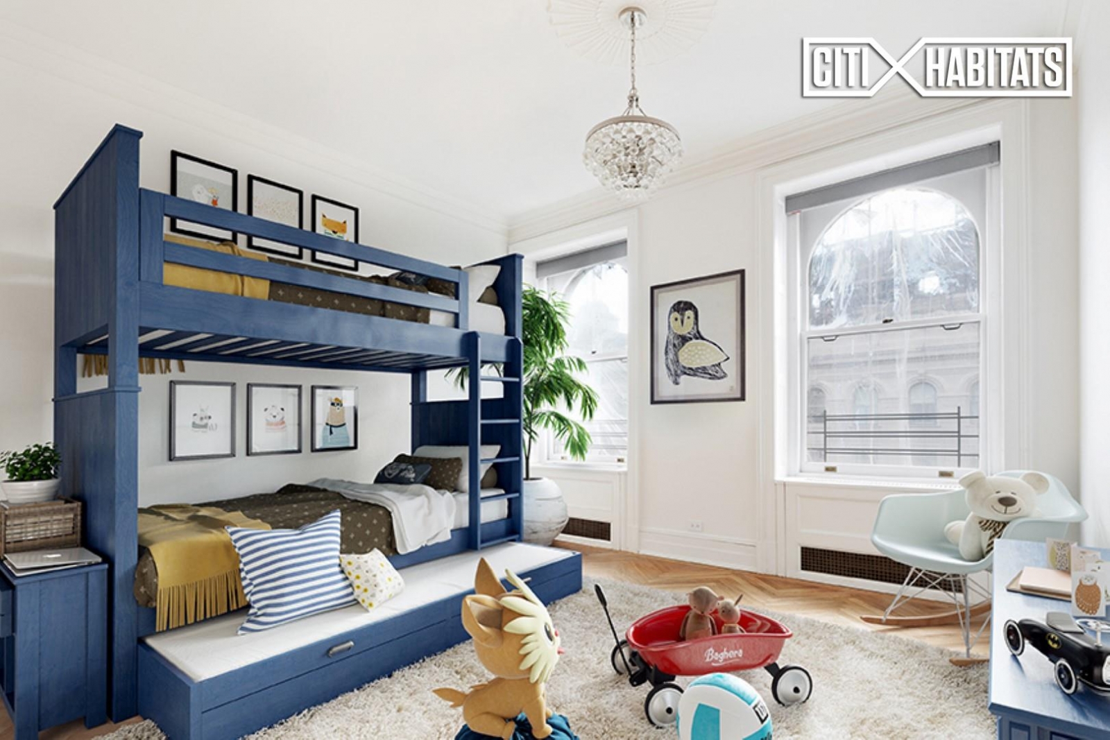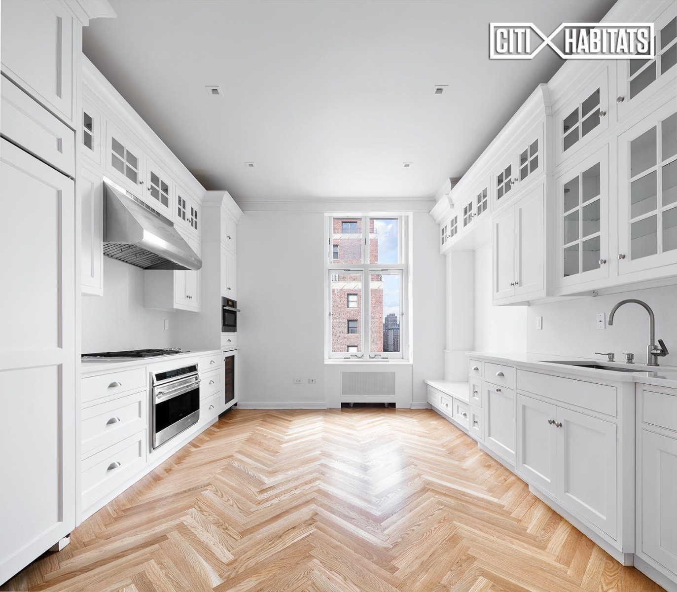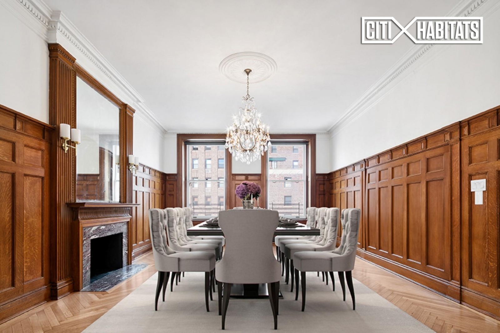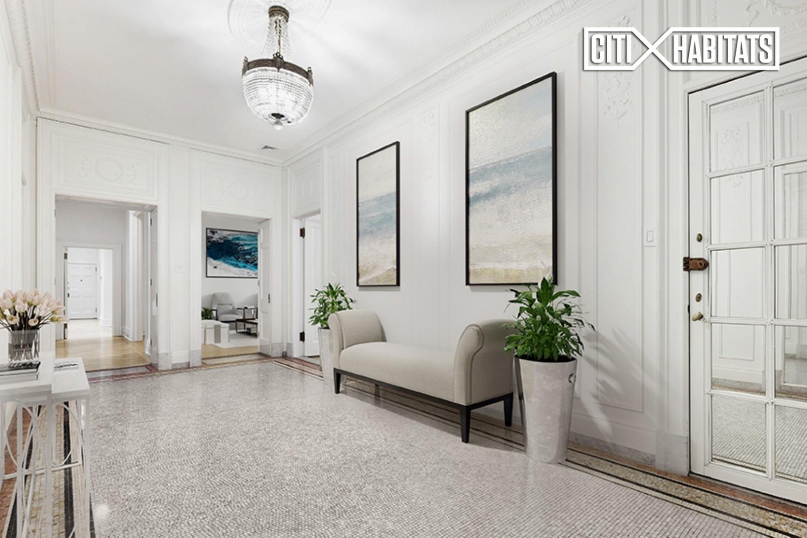 The condo measures more than 3,000 square feet and features elegant pre-war details including crystal chandeliers and ornate moldings and fireplaces. A marble entryway leads to the formal dining room and sunny chef’s kitchen and flows into the living room. It has four bedrooms and four bathrooms and includes separate residential suites.