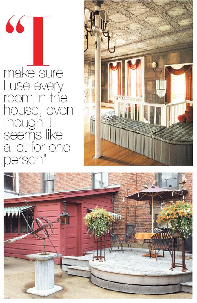 Doing his own demolition and contracting, Mulford lived in three rooms upstairs. Pulling down Sheetrock, dropped ceilings, and fluorescent lights, he set free the building’s 40-by-45-foot ballroom, where he frequently throws parties, complete with pressed tin walls and ceilings and a (non-period) disco ball. The living quarters now include several bedrooms, sitting rooms, an office, kitchen, and dining room. “I make sure I use every room in the house,” he says, “even though it seems like a lot for one person.”