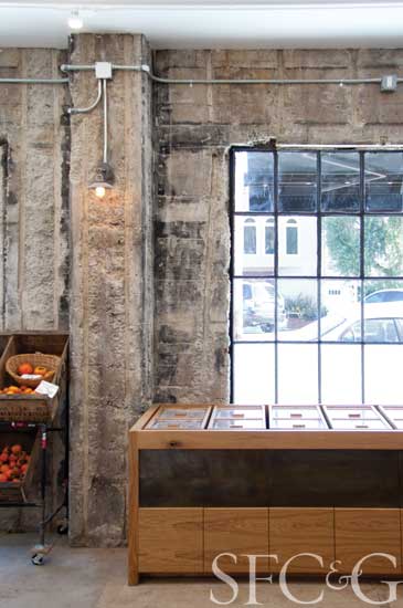 The local sensibility is also reflected in the store’s interior, designed by San Francisco husband-and-wife team Seth Pare-Mayer and Kelli Franz of Atelier KS (the designers behind Local Mission Eatery). The pair transformed the former factory, largely vacant for the past two decades, into a warm modern space with repurposed old-growth redwood (discovered in the walls of the building), exposed concrete floors, large storefront windows and details such as vintage produce crates and handsome wood-trimmed bins.