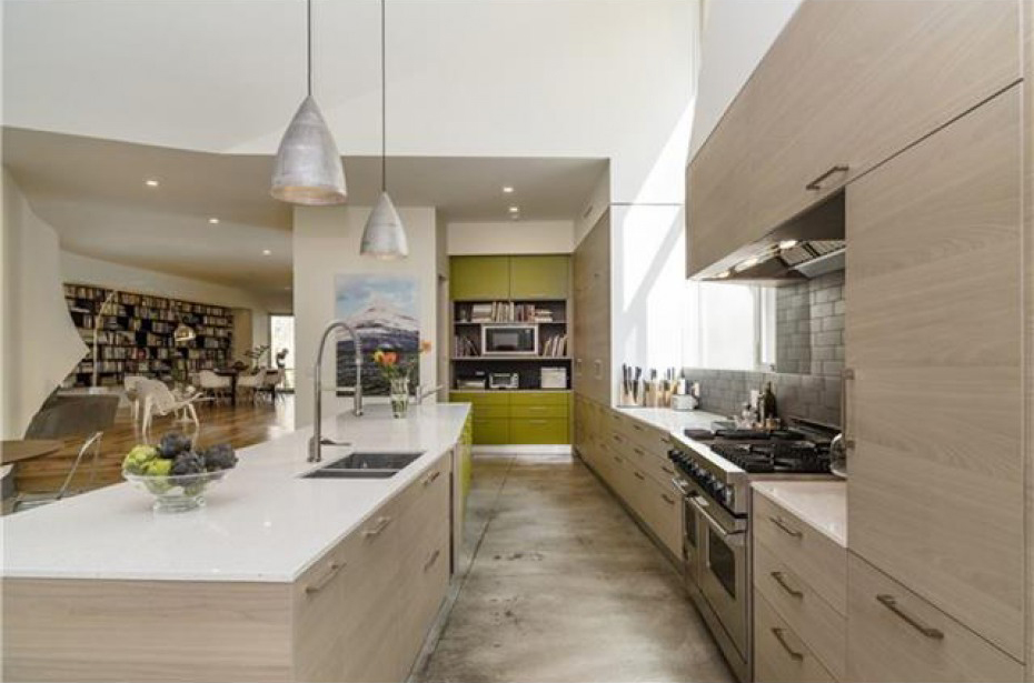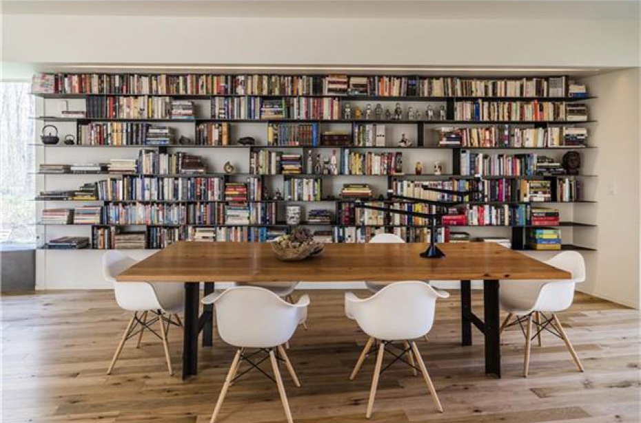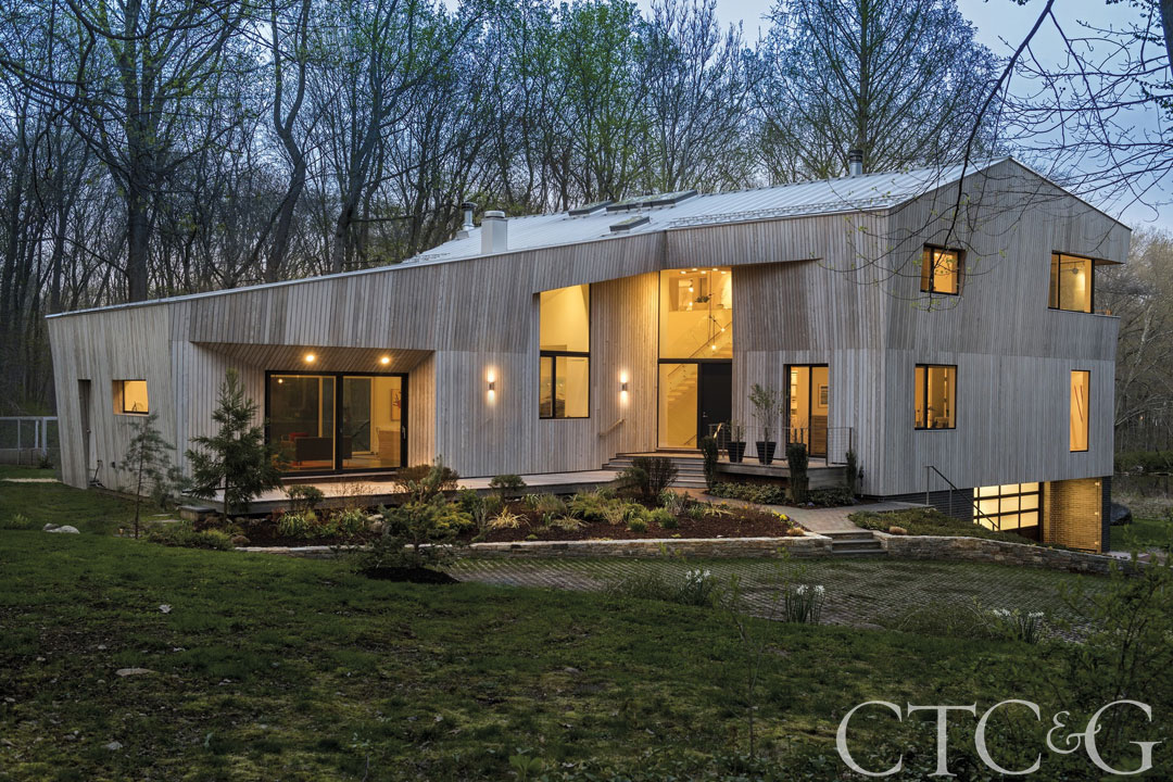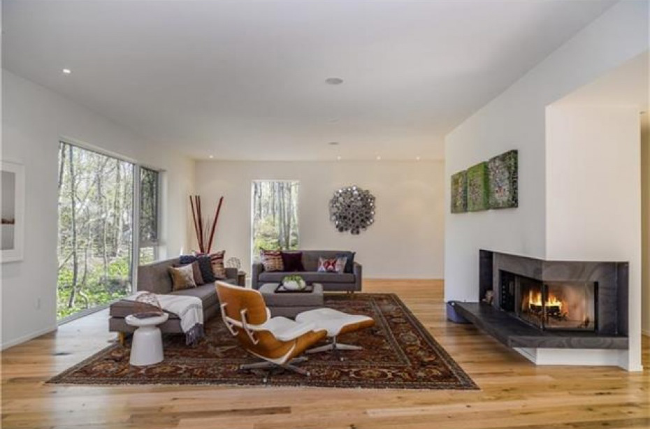 Brooklyn-based architecture firm su11 designed a Darien modern (built in 2011 by Prutting & Company) that’s newly listed for $3,395,000. A façade of natural-wood and glass blends beautifully with the surrounding nearly three-acre wooded grounds. Inside, the open-plan scheme centers on a lofty kitchen, dining and living area with a couple of super-cool fire features: There’s a glass-front, wraparound fireplace and another one built into a dramatic sculptural white wall. Additional groovy features include a built-in backlit bar and a wall of olive-green cabinets in the kitchen. In all, the 6,832-square-foot home offers five bedrooms and six bathrooms, including the master suite with a sitting room and balcony. Molly O’Brien Watkins of William Pitt Sotheby’s International Realty has the listing.