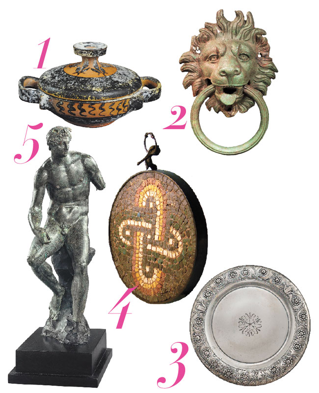 Long before Elizabeth Arden and Estée Lauder hit the scene, ancient Greek women made their own cosmetics and stored them in a lekanis, a vessel often presented by a father to his daughter on her wedding day. This 6½”-diameter, circa 350–330 b.c. lidded ceramic lekanis was unearthed in Magna-Graecia, a region of coastal southern Italy that was home to many Greeks of the era. $2,150, Aphrodite Ancient Art, 1200 Fifth Ave., NYC, 212-987-9878.