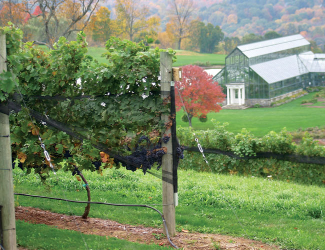 LAND OF PLENTY The quest to be a good steward of the land and preserve the agricultural roots of the area prompted the 1980s purchase of acreage adjacent to this NYC financier’s weekend getaway. And property manager Greg Bollard makes that his priority in every project at the farm. “We regularly employ biorational controls encouraging nature’s predators to live near what we grow. We even use beneficial insects in our greenhouse for our crop management,” he explains. “We try to coexist with as many beneficial things in nature as possible to get to our end product [from honey and maple syrup to peaches and wine].” Produce is treated with all-organic pesticides, and Greg follows many NOFA (Northeast Organic Farming Association)-approved methodologies. Ever the good neighbor, Maywood participates in the “Plow to Plate” initiative at New Milford Hospital, which sources locally whenever possible. Much of the 1,000-acre property is woodlands, which provide lumber for barrels (made by a Pennsylvania cooperage) for the wine. Nothing is sold on site here; however, this gentleman farmer also owns the Bridgewater Village Store, where you’ll find everything made or harvested at Maywood Farm, except the wine. You’ll have to leave town to buy that, since Bridgewater is a dry town.