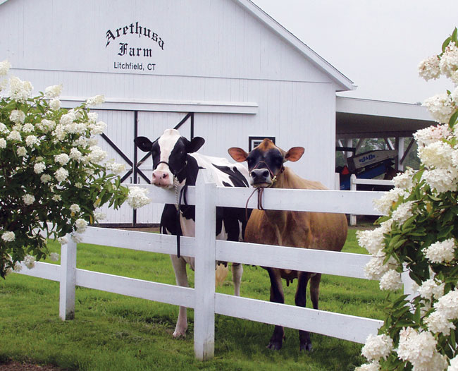 LADIES FIRST The sign in the milking barn states: “Every cow in this barn is a lady; please treat her as such.” These well-heeled ladies are known for their “high-quality natural milk.” And once you know who owns the place, you’ll want to spend the day in their shoes…well, maybe their owners’ shoes, that is. George Malkemus and Tony Yurgaitis (president and vice-president, respectively, of Manolo Blahnik, USA, in New York City) moonlight as gentleman farmers at Arethusa Farm, adjacent to their 18th-century weekend home in Litchfield. Clearly, cow comfort comes first here. “We pay close attention to every animal, so we can manage their development. This is done by providing our cows with excellent care, a safe and comfortable environment, and an excellent nutrition program,” notes Tony. The demand for quality continues at the new Arethusa Farm Creamery in Bantam: “We are exclusively using our milk in cheeses, yogurt and ice cream,” says farm manager Terri Packard. For the creamery’s design and creation, “I worked very closely with my dairy manager and cheese maker Chris Casiello on selecting all of our state-of-the-art equipment, as well as developing our line of products. Our creamery is a full-fledged dairy plant. We also have a full cheese-making facility on the second floor where we can make and age cheese,” says Tony. “In the retail space [coming this summer], we will carry all of our dairy products: milk, butter, eggs and yogurt.” In addition, Tony promises they will introduce some unique products from Europe.