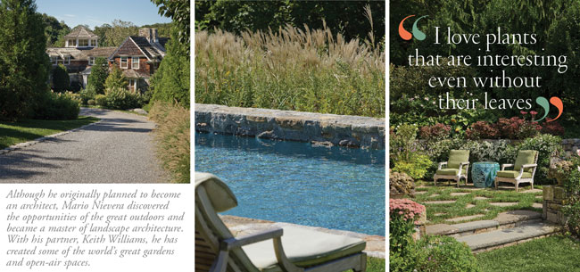 and driveways interesting too. Snowfall patterns on a cobblestone driveway or branches silhouetted in snow can be very cool. How do you avoid feeling restricted by nature’s palette of green? I like the challenge of combining different greens and textures. And I love plants that are interesting, even without their leaves. You call driveways a blight. How do you tackle them? The scale has to be appropriate to the surroundings. I particularly like driveways that are a little too narrow; it slows you down so you experience the property, and it makes the landscape look larger than it is. When it’s time to park the car, the space should be small—you don’t need to create a parking lot on your property. What is the biggest budget strain in landscape design? There are a lot of sensitive unseen expenses—drainage, soil, grading. It’s frustrating for people to spend 25 to 40 percent of their money on things hidden beneath the plants. Chicago-area Olmsted designs influenced you. What was it like revamping an Olmsted design at a New Jersey estate? Over time things don’t last—maybe there has been a lack of maintenance, views might have changed. I think the key is to try to understand the philosophy of what was done. You have to adapt, while still paying respect to what was originally there. What makes Connecticut a place you say you dream about? It has incredible topography, trees, shoreline, plus communities that are well put together. I love the little rock outcroppings, the roads lined with maples and beeches. You can have really wonderful gardens and landscaping. What’s your key to successfully working with clients? Everyone has strong opinions about interiors and buildings, but landscape is very objective. It’s often hard for people to articulate, so I have to listen very hard to what they’re trying to describe and learn to extrapolate and manipulate to achieve what to me is the big payoff: the sheer joy I get out of seeing their faces when we’ve met and exceeded their expectations.
