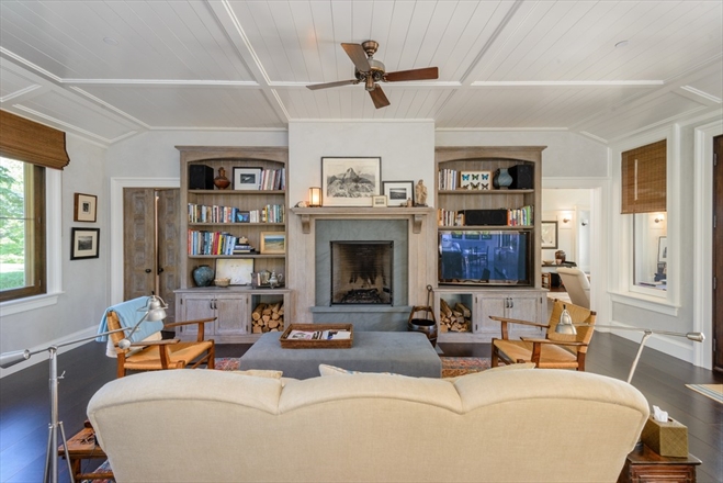 A fireplace anchors the living room.