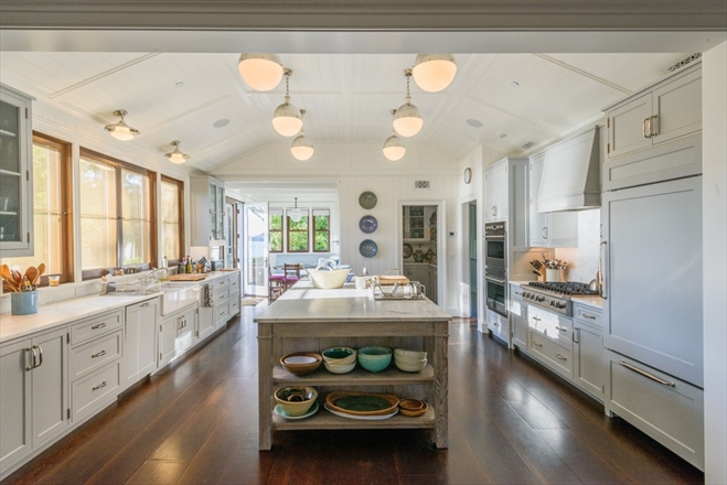 The spacious kitchen includes an island and breakfast area.
