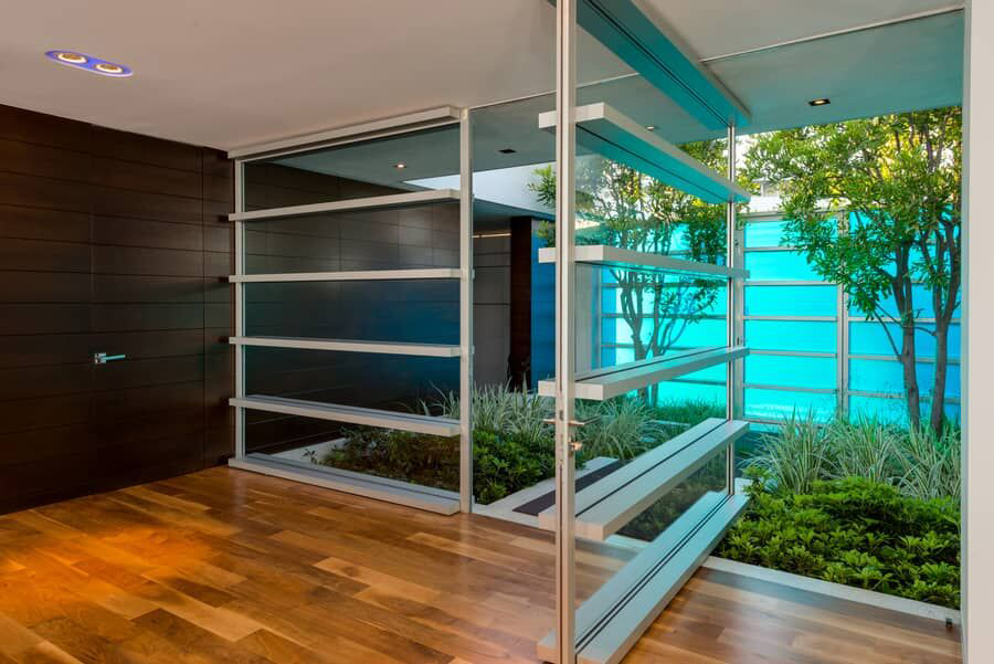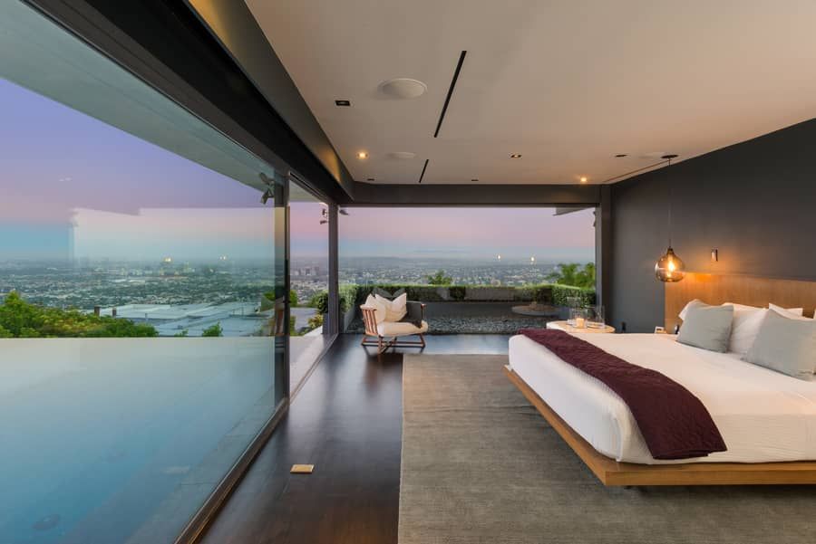 From the front, this panoramic paradise looks a bit underwhelming, but that changes immediately upon entry through ultramarine glass panels into an atrium courtyard. The living space beyond is an open floor plan sporting lustrous hardwood floors that segue seamlessly into the outdoor door area fit for a prince with a scintillating view of the city and an infinity pool. The view is the same whether you’re inside or out because it’s a crystal clear floor-to-ceiling glass door that separates the chic interior from the resort-like backyard. You’ll find stepping stones in a small pond, and fire chalices in this backyard retreat that make entertaining a no-brainer. The home also includes a master suite that opens into the pool area. Directly below that is a state-of-the-art screening room that offers a view into the LED-lit depths of the water.