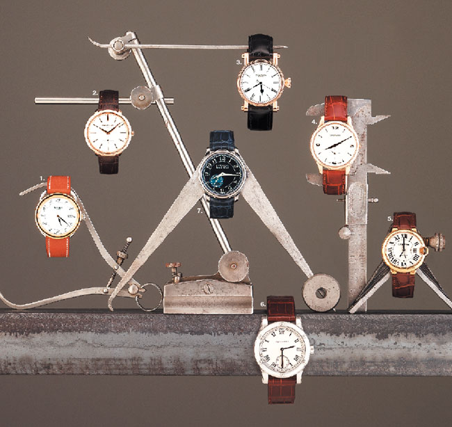 1. Hermès Arceau in stainless steel with natural leather strap. $5,700, Hermès, 289 Greenwich Ave., Greenwich, 203-622-3007, hermes.com. 2. Patek Philippe 18K rose gold Calatrava with brown alligator strap. $26,800, Lux Bond & Green, 46 LaSalle Rd., West Hartford, 860-521-3015. patek.com, lbgreen.com. 3. Speake-Marin Resilience in 18K red gold with black alligator strap. $24,000, Manfredi, 121 Greenwich Ave., Greenwich, 203-622-1414, speake-marin.com, manfredijewels.com. 4. Chopard L.U.C XPS in 18K rose gold. $16,780, Manfredi, 121 Greenwich Ave., Greenwich, 203-622-1414, chopard.com, manfredijewels.com. 5. Cartier Ballon Bleu in 18K pink gold. $26,200, Mitchells, 670 Post Road East, Westport, 203-227-5165, cartier.com, mitchellstores.com. 6. Ralph Lauren Sporting Classic in stainless steel with brown alligator strap. $11,800, Ralph Lauren, 265 Greenwich Ave., Greenwich, 203-869-2054, ralphlauren.com. 7. F.P. Journe Chronomètre Bleu in 18K rose gold in tantalum with blue dial. $19,890, Manfredi, 121 Greenwich Ave., Greenwich, 203-622-1414, fpjourne.com, manfredijewels.com.