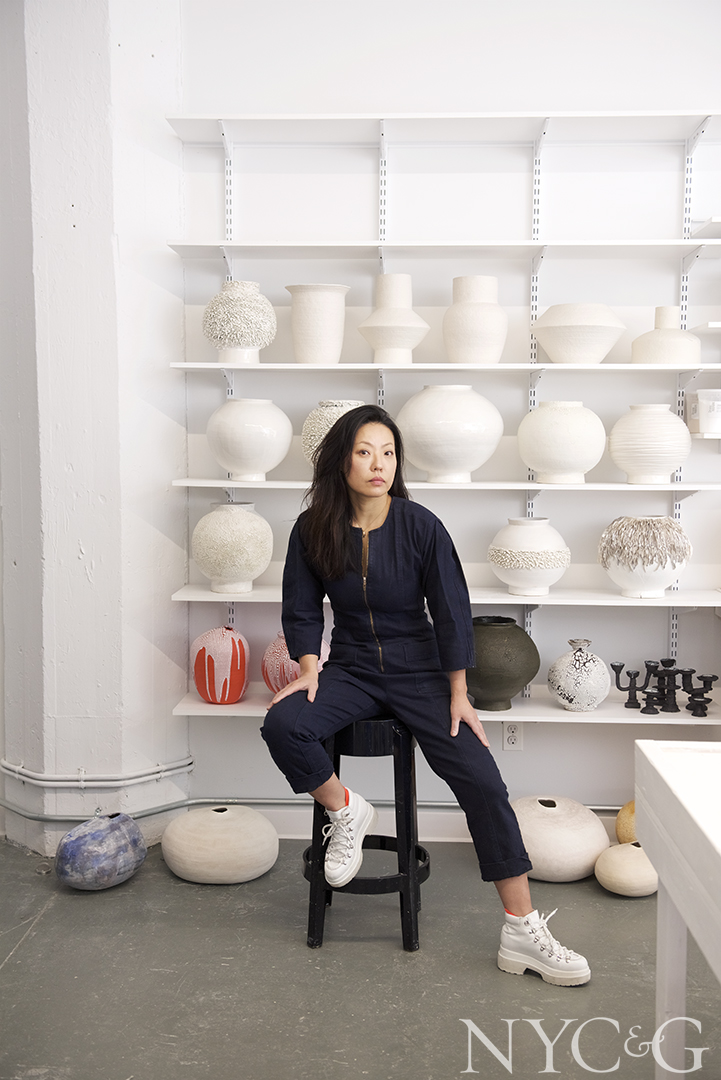 Recently, she has focused on reinterpreting late-18th-century Korean moon jars, known for their glossy white exteriors and lunar forms. “I was never fond of them growing up because my taste was more modern,” explains D’Haene, a native of South Korea who moved to Scarsdale at 17 and studied architecture at the Cooper Union for the Advancement of Science and Art. “But now, I think they’re beautiful.”