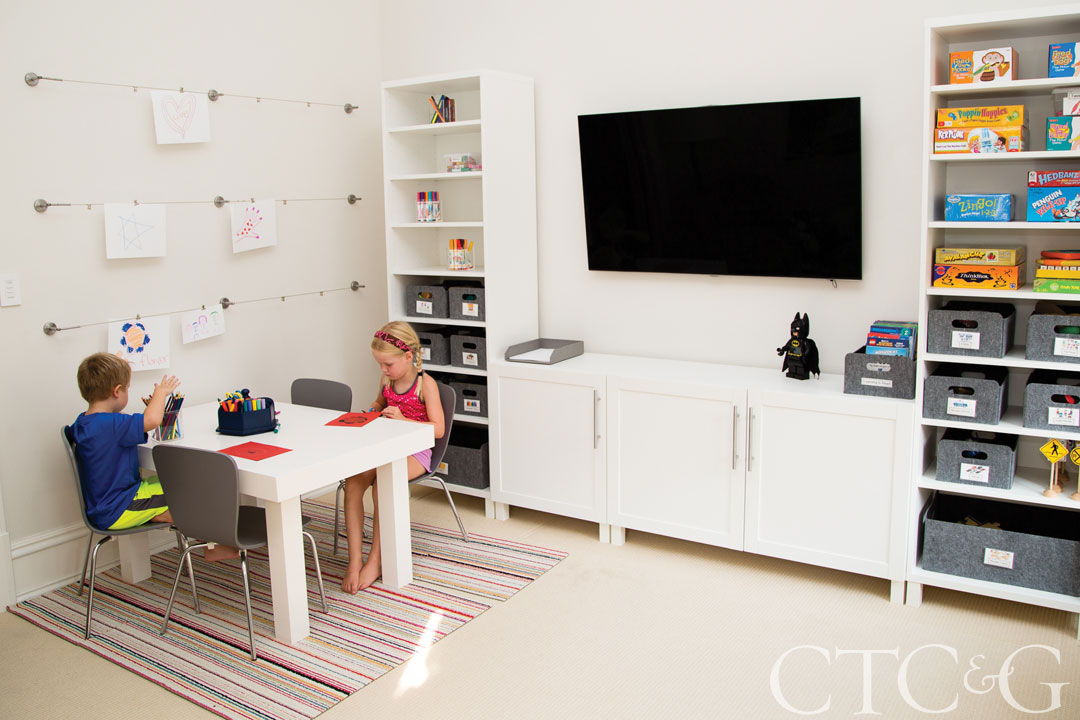 What’s the benefit of a well-designed playroom? Free play has educational value. Cool, organized, inviting, accessible places where kids want to spend time provide educational benefits and help them gain cognitive skills. Many of today’s playrooms are in out-of-the-way areas like the basement with floor-to-ceiling built-ins with way too many toys stored in huge bins. Both the children and the parents are overwhelmed. Kids under age five rarely go down to a basement playroom by themselves. If it’s dark and uninviting; they’re not going to go there. It’s not a fun place to be.