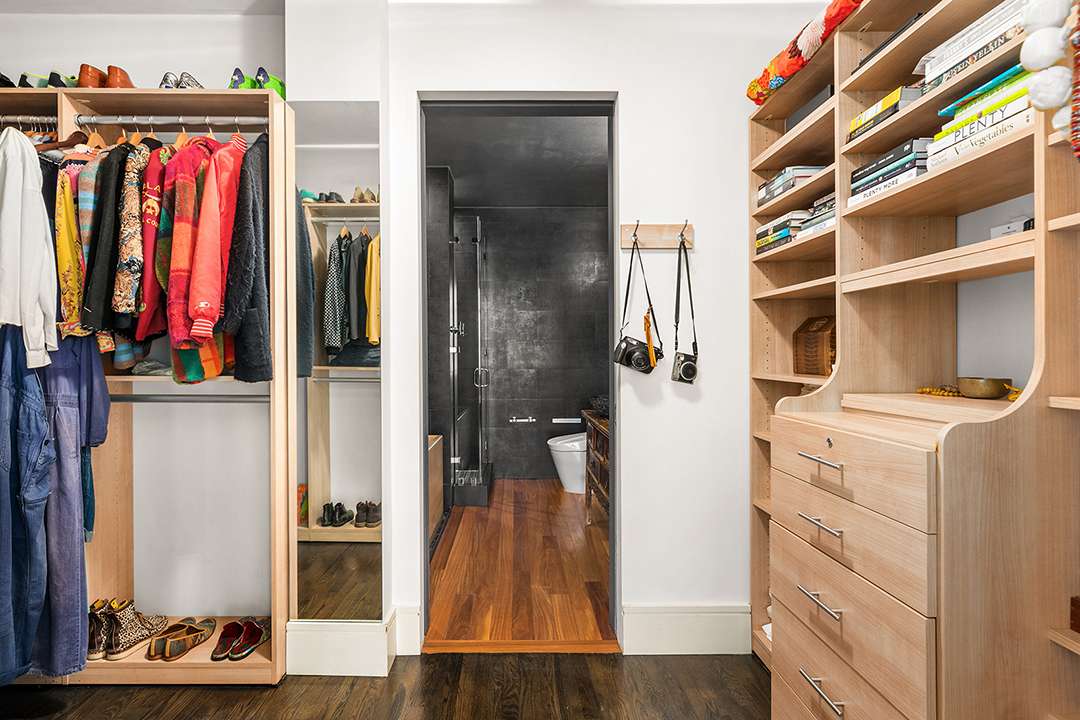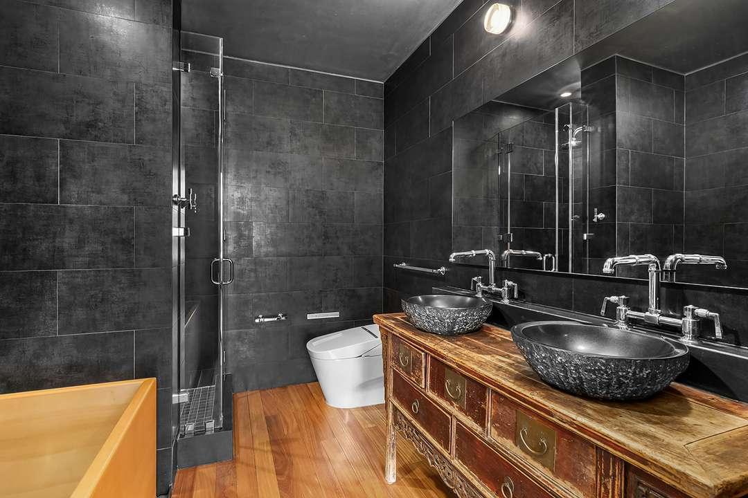 An airy chef’s kitchen is sleek and boasts top-of the-line appliances, while the dining room and living room provide extra relaxation space. With three bedrooms, the producer could host guests when necessary or feel right at home creatively with his instruments. The primary suite is simple yet chic, complemented by a moody bathroom, featuring black tiling and a walnut soaking tub.
