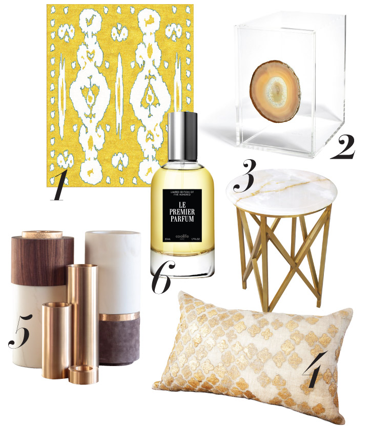 4 Give your sofa a sophisticated boost with this decorative pillow in a cotton/linen/silk blend, featuring a gold-painted quatrefoil detail. $145, at Marie Eiffel, 13 Grand St., Shelter Island, 212-945-8492.