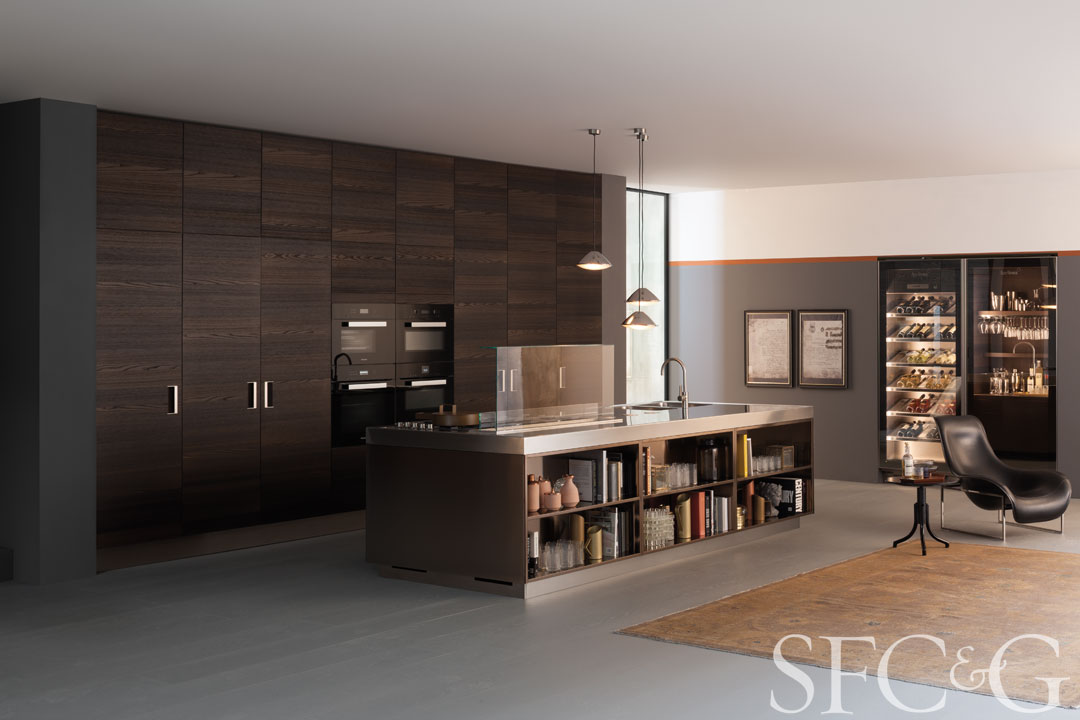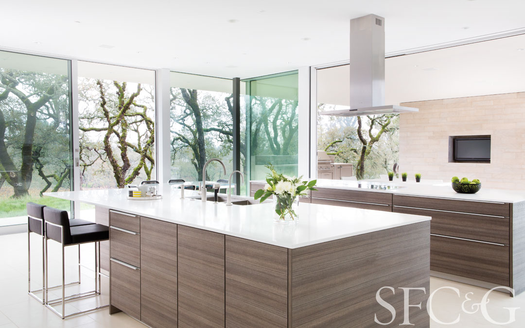 A Northern California twist on contemporary architecture is the use of warm woods, another design detail that sets some of our top-of-the line kitchens apart: Think sleek renditions of natural, raw and reclaimed wood. Boffi recently showed a kitchen clad in abonos oak, an ancient wood preserved in bogs. Another trend is colored stainless steel, which is plated using a technique called Physical Vapor Deposition (PVD) to resemble brass, rose gold and other warmer metals. Dimmable LED under-cabinet lighting also helps the kitchen to function as an entertaining space.