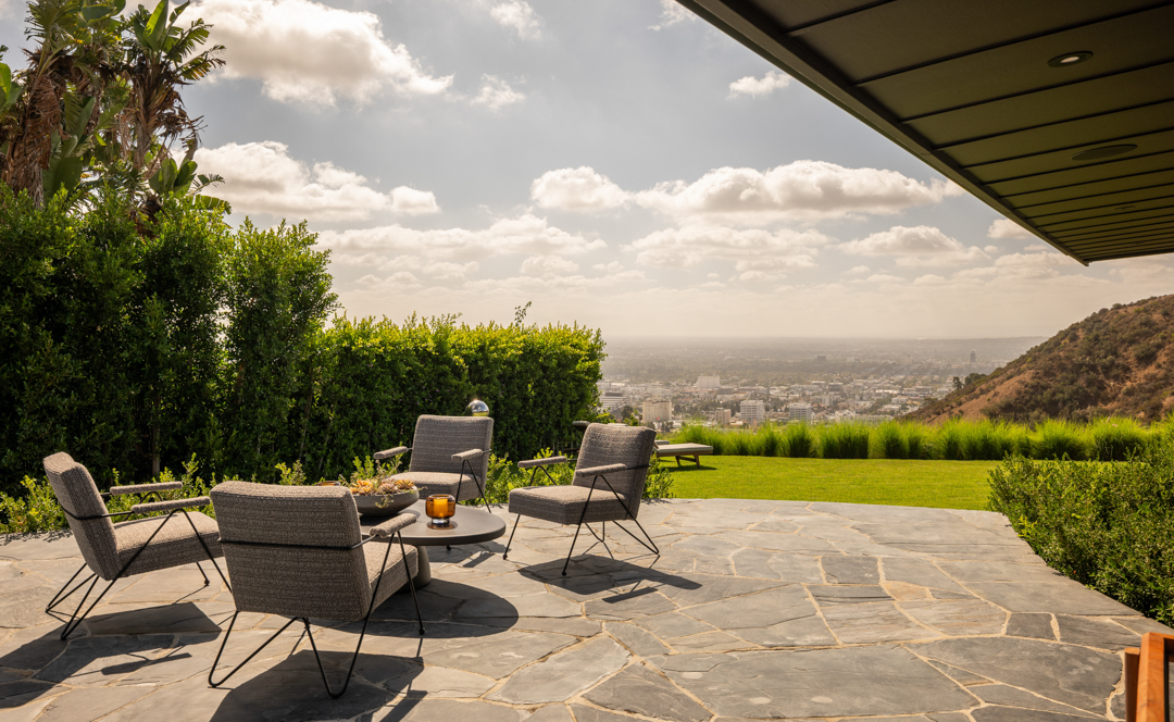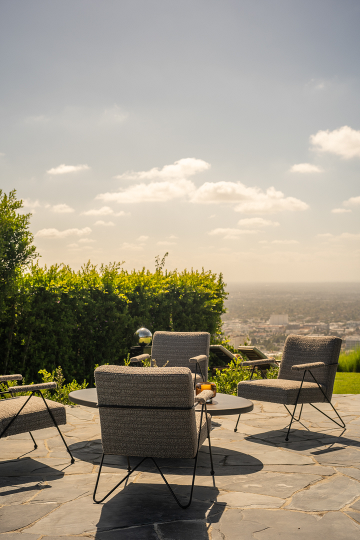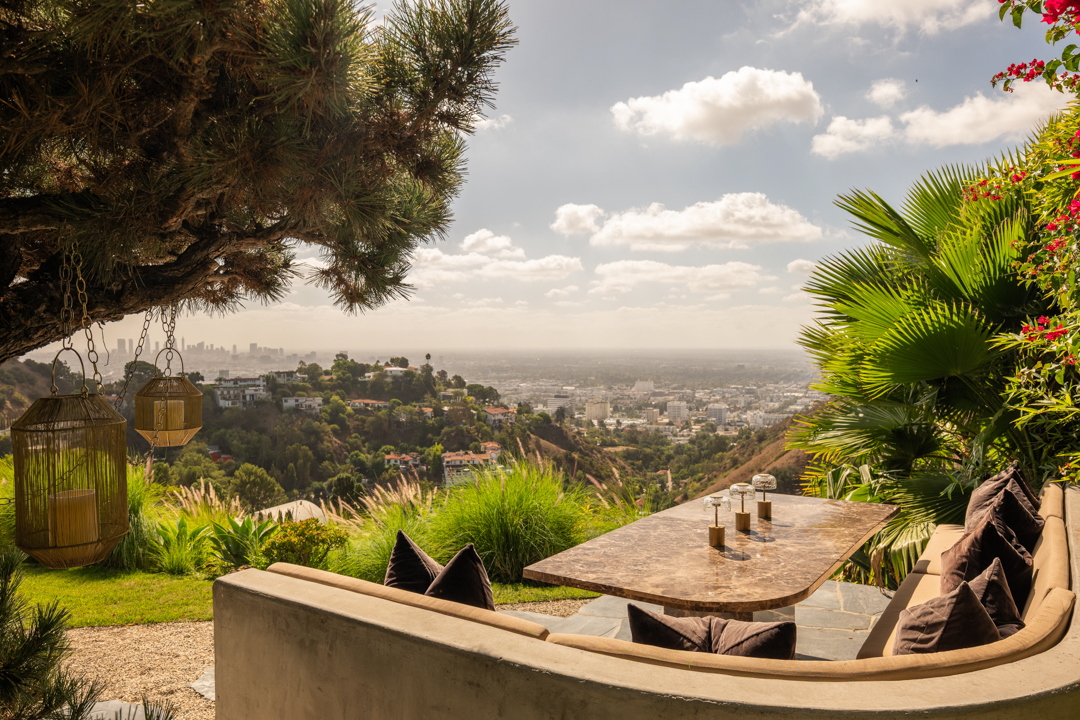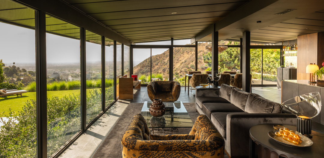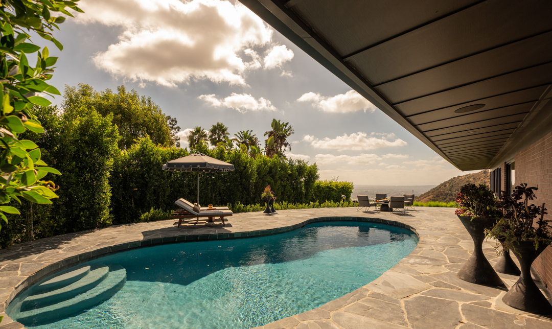 Glassy and chic, the midcentury gem is ideal for a stylish singleton or couple as it offers just 2,000 square feet, with three bedrooms and two bathrooms. Today, its especially suave with custom furnishings in top-of-the-line fabrics like Schumacher, Perennials, Pierre Frey, and Dedar. Floor-to-ceiling windows blur the lines between indoors and out, with panoramic views of Los Angeles showing off what a prime location it’s perched in. Outside, there is complete privacy. A stone walkway leads to the home, while a swimming pool and plenty of lounging terraces await out back. The two-car garage is equipped with a Tesla charger.