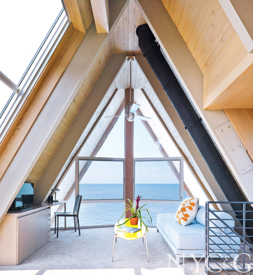 After nearly three years of planning, permitting, and construction, the renovation of our 1965 A-frame on Great South Bay is finally finished, and the results are arresting—even in a community famed for its mid-20th-century architecture. What began as a clunky triangle (think meh-frame with dark, unusable spaces and a treacherous spiral stair) is now a testament to efficiency, simplicity, and beauty, with energy-friendly materials and technologies. As a friend noted upon its completion, “It looks like a glamorous UFO. Of course people are going to want to see it up close.”