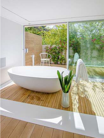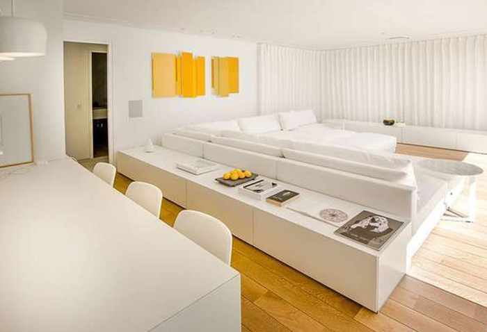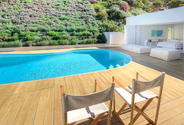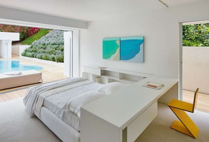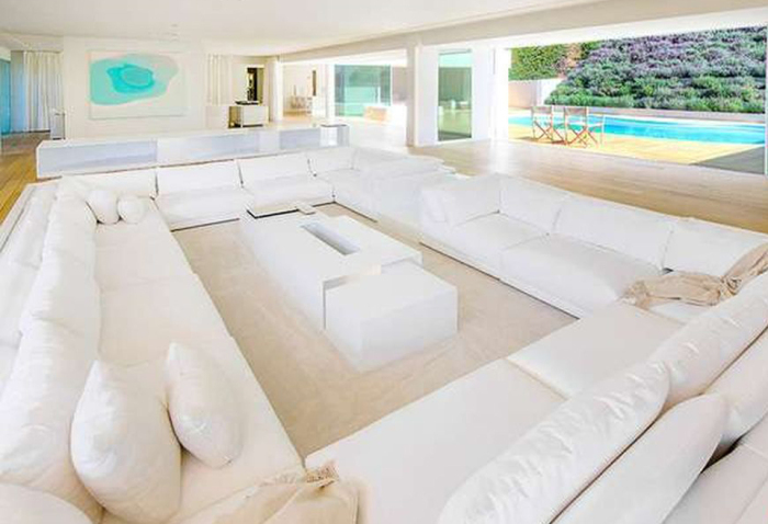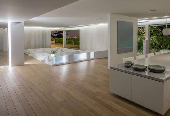 The strikingly modern residence is situated behind privacy hedges in Beverly Hills’ exclusive Trousdale Estates. An all white interior spans over 4,000 square feet and boasts open living spaces including a sunken living room, entertaining-ready dining room, a media lounge and a glossy kitchen. Sliding glass panels let in plenty of sunlight and make for easy indoor/outdoor living.