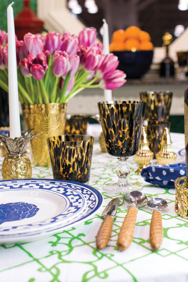 What are three essentials to a successful tablescape? The first is layering—tablecloth, chargers, plates and accessories. I love to set a table with brass accessories like beetles or whimsical salt and pepper shakers. The second is mixing high and low materials: Combine a natural rattan with elegant tortoise and brass. The mix is unexpected and chic. Finally, always stick with low floral arrangements and unscented candles.