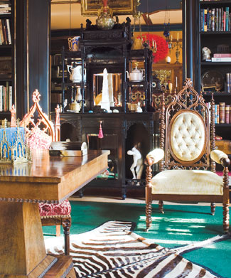 Which is not to say that the couple’s leanings are limited to classic American antiques. Throughout the house eclectic treasures fill every crevice: a crewelwork pillow, an African headdress, a taxidermied peacock. The upstairs sitting room is an Orientalist fantasy of Aesthetic Movement and eastern-inspired decor, while the library features a Moorish-star ceiling decoration and four massive bookcases fashioned from a paneled room they purchased in its entirety and later had second thoughts about. The designers realized they “respected the house” too much to shoehorn an alien room inside it, and were unfazed when the individual bookcases proved to be too large to move up the stairs. “I just sat downstairs with the saw and started cutting,” Wagner says with a laugh. Even a discarded gilt sunburst frame—part Hollywood Regency, part Super Fly—is being resurrected as a ceiling medallion. “It’s a piece of garbage, but it’s got style!” Van Dam says. “We don’t go looking for things; we’re just always looking.”