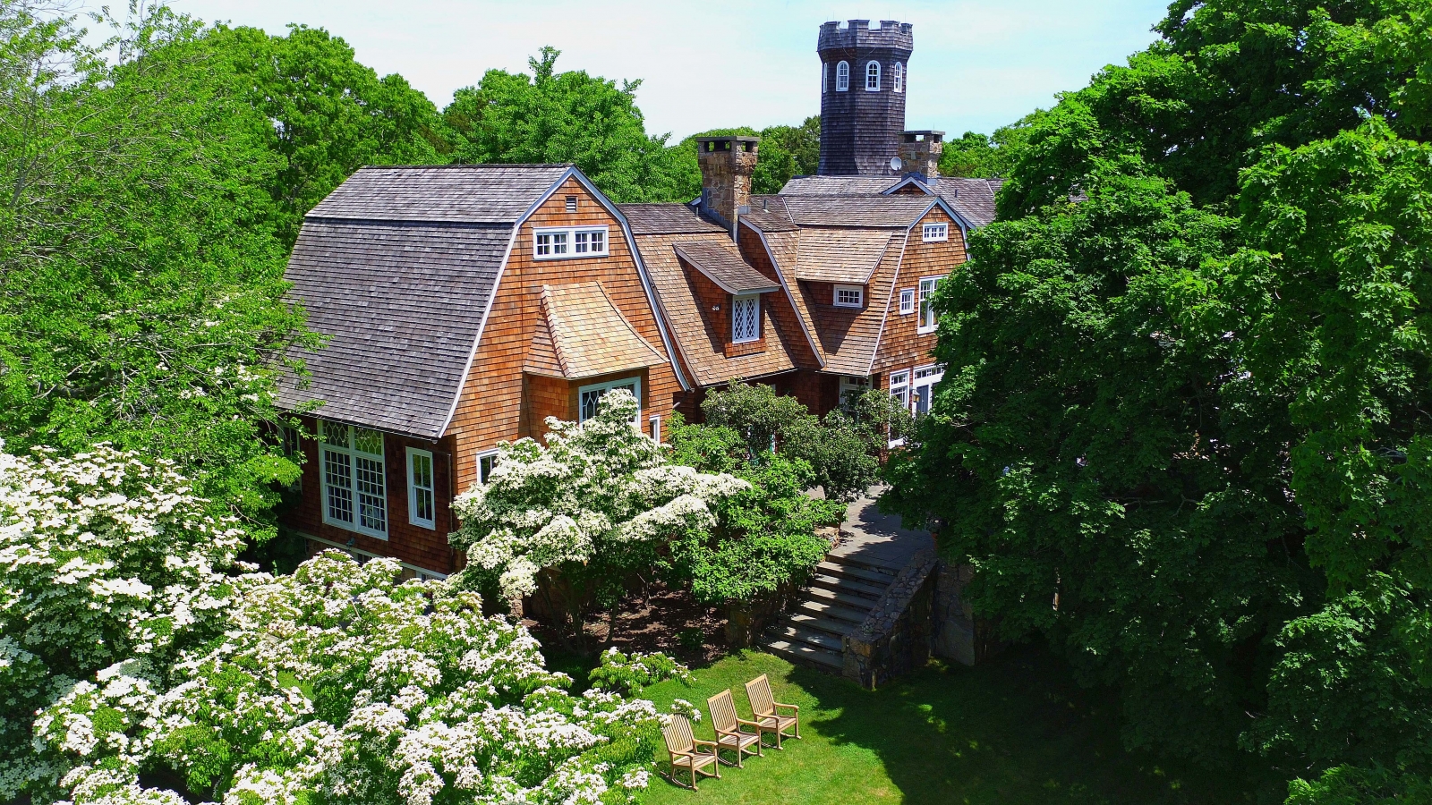 Beyond the gated driveway lie 20 acres of manicured lawns featuring walking paths, a tennis court, a Gunite pool and a 50-foot observation tower boasting views of the Atlantic Ocean and Connecticut shoreline. Inside the shingle-style home, a charming country kitchen flows into a breakfast area and family room, where French doors and oversized windows let in plenty of natural light. The double-height great room, which features one of the home’s three fireplaces, is a great entertaining space and the party can continue outdoors under the wisteria-covered pergola.