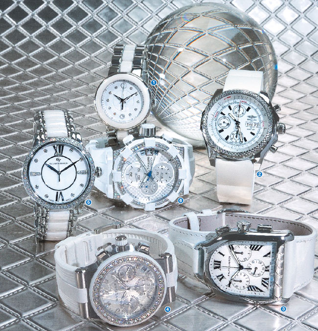1. Movado Cerena watch with diamonds, and stainless steel and white ceramic bracelet. $1,295, movado.com. 2. Breitling for Bentley GT II Ice watch with rubber strap. $7,265, Lenox Jewelers, 2379 Black Rock Tpke., 203-374-6157, Fairfield, breitlingforbentley.com. 3. Ralph Lauren Stirrup watch in stainless steel with white calf strap. $6,600, Betteridge Jewelers, 117 Greenwich Ave., Greenwich, 203-869-0124, ralphlaurenwatches.com. 4. Bulgari Diagono Chronograph 35-mm watch with stainless steel and diamonds on a rubber strap. $13,300, Manfredi, 121 Greenwich Ave., Greenwich, 203-622-1414, bulgari.com. 5. David Yurman Classic 38-mm watch in white ceramic and stainless steel. $6,600, Lux Bond & Green, 169 Greenwich Ave., Greenwich, 203-629-0900, 136 Main St., Westport, 203-227-1300, davidyurman.com. 6. Concord Chronograph 44-mm stainless steel and diamond case, white fiberglass dial, rubber strap. $17,700, Tourneau, 12 East 57th St., NY, 212-758-7300, concord.ch. Quilted lacquer washable-vinyl wallcovering. Phillip Jeffries Ltd., 973-575-5414, phillipjeffries.com.