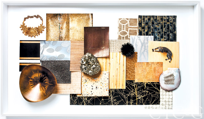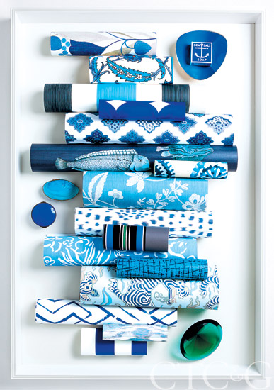 Papers by: Dedar, Jocelyn Warner, Zoffany, Elitis, Clarence House, Peter Fasano, Larsen, Hinson, Winfield Thybony Design. Necklace and bowl, Antique & Artisan Center. Mineral speciman, Creel and Gow.