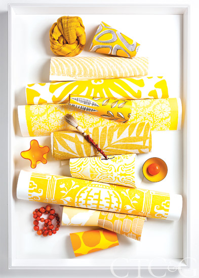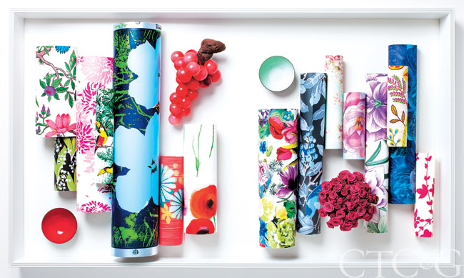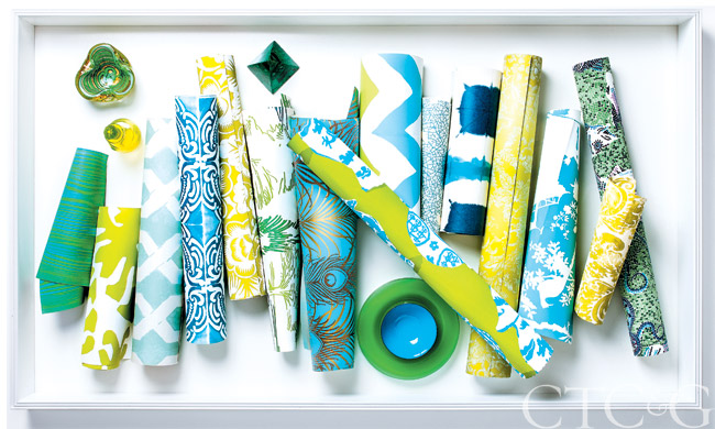 Papers by: Lucy Rose Design, Tyler Hall, China Seas, Lucy Rose Design, Scalamandré, Tillett, Christian Lacroix, Clarence House, Thibaut, Lucy Rose Design, Marimekko. Scarf, Privet House. Calligraphy brush, Murano bowl and enamel bowl, Antique & Artisan Center.