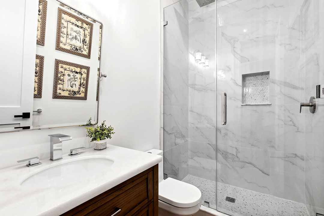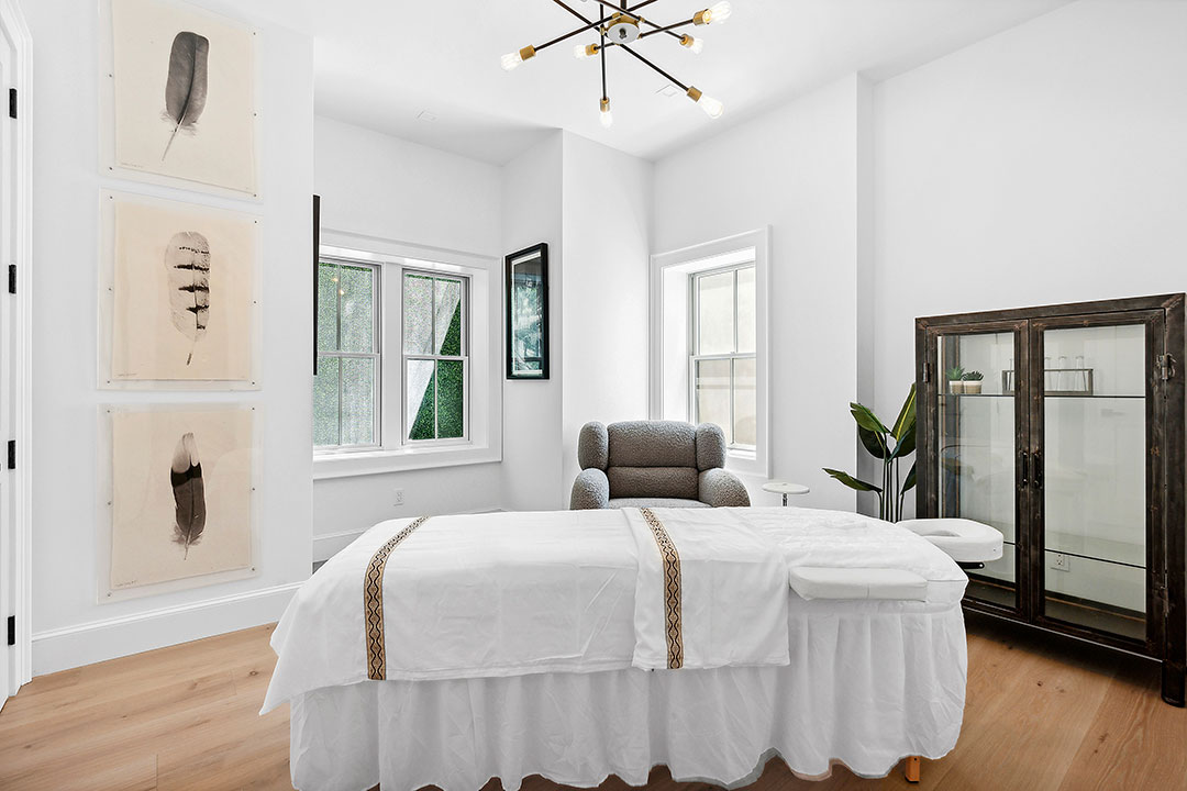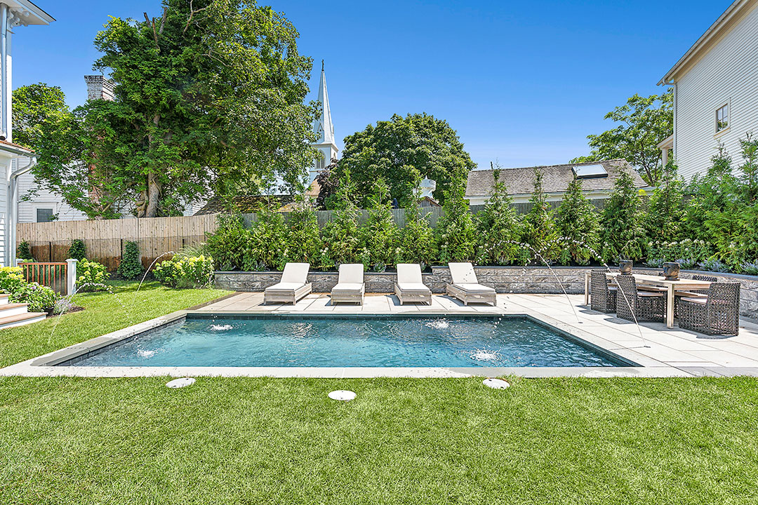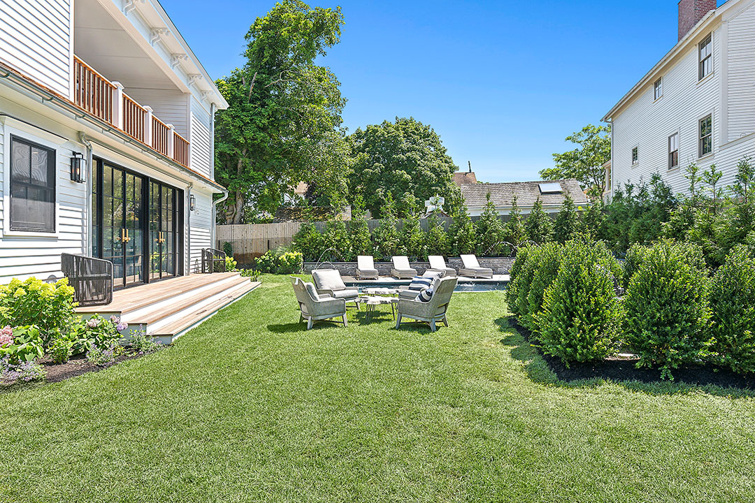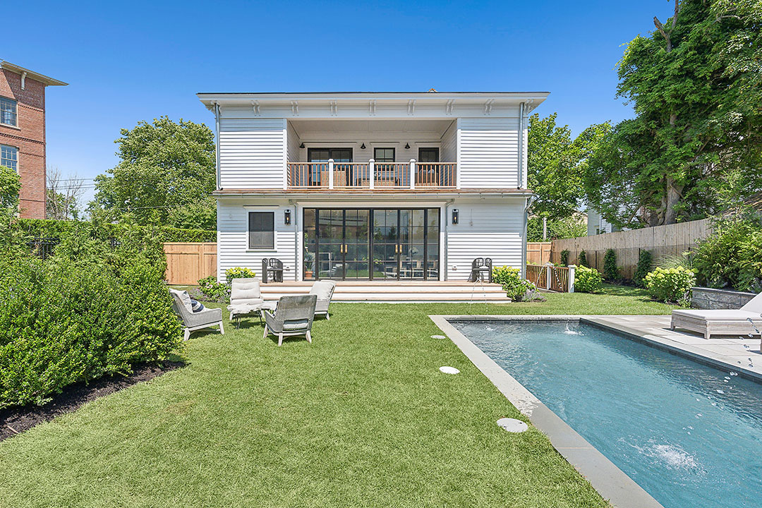 Seeing it now, you could hardly imagine the dwelling that way. Across its 5,000 square feet, there are six bedrooms, six bathrooms, and one half-bath. The turnkey residence boasts a chef’s kitchen, bright living spaces, and a gunite swimming pool, with a wall of glass doors bridging the indoor and outdoor spaces. Other chic updates include the black casement windows contrasting the white facade, spa-worthy showers with stunning stone, and a variety of refined light fixtures in line with the coastal location. All furnishings pictured are also available for purchase.