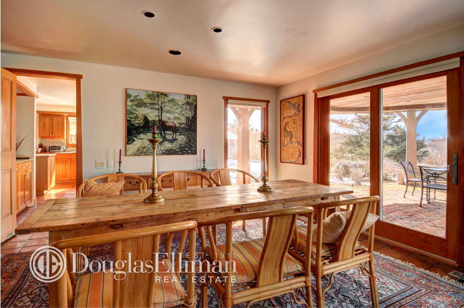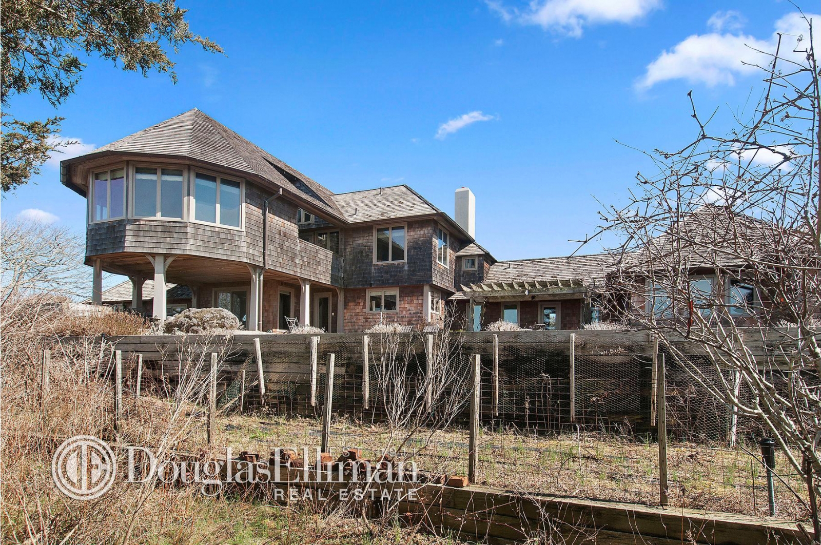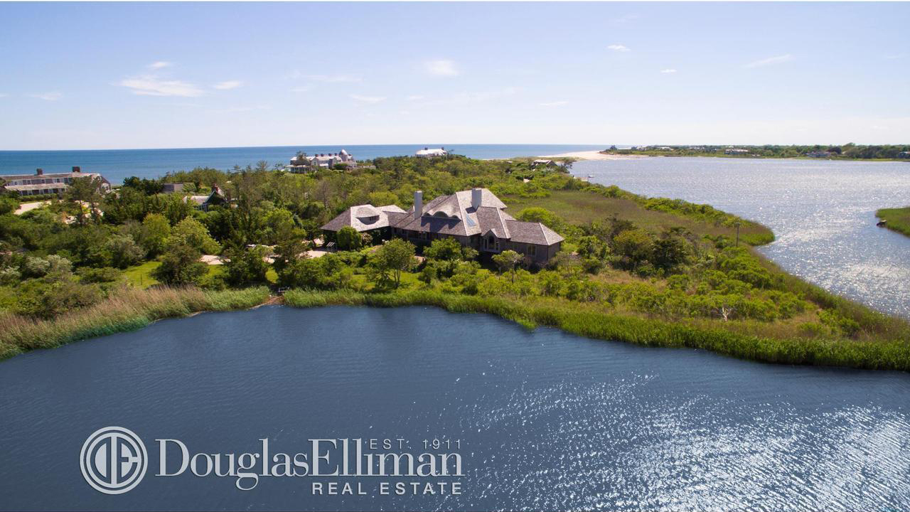 Surrounded by nature preserves, its location affords complete privacy and the interiors feature 4 bedrooms and bathrooms as well as beach stone fireplaces. The 2.7-acre property has a pool and several hundred feet of frontage on Georgica Pond.