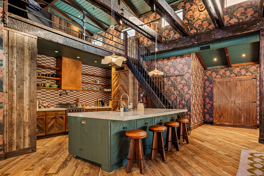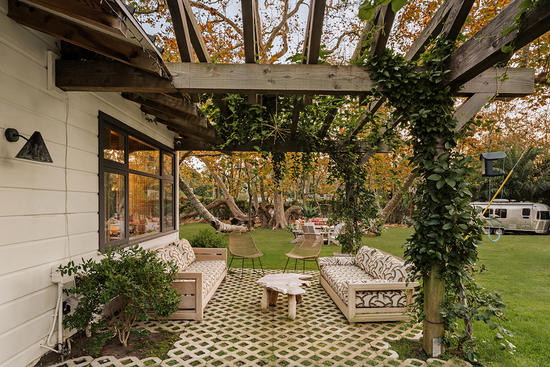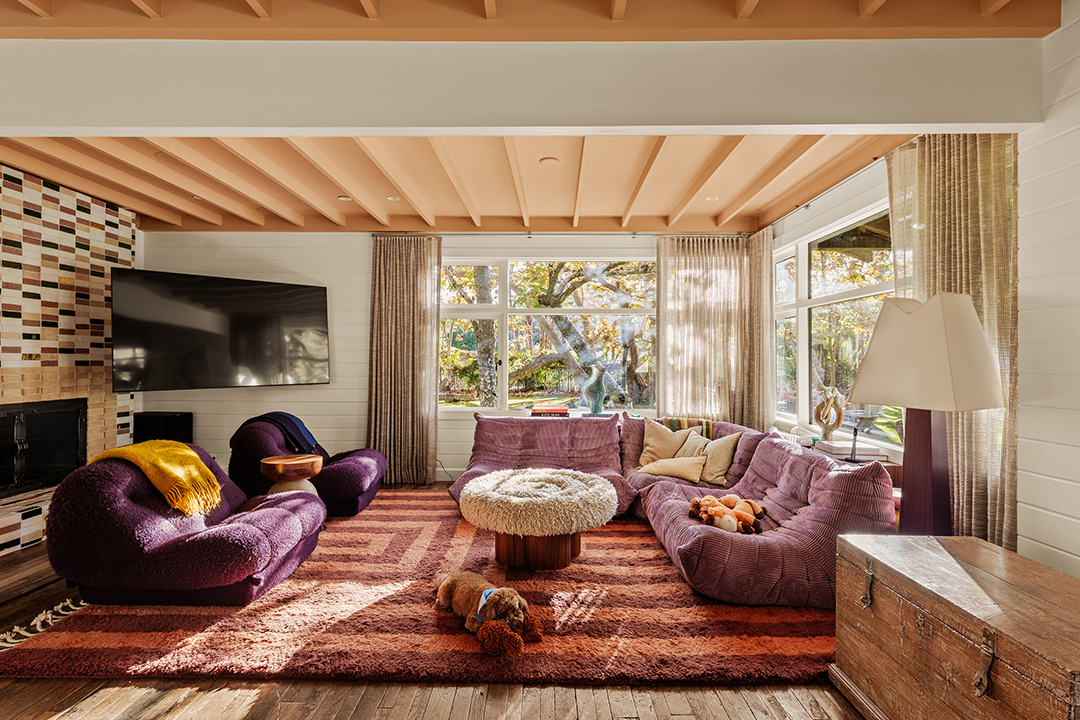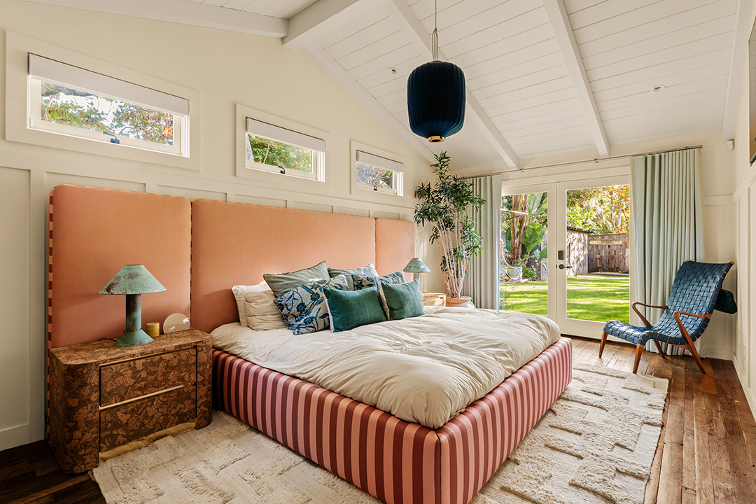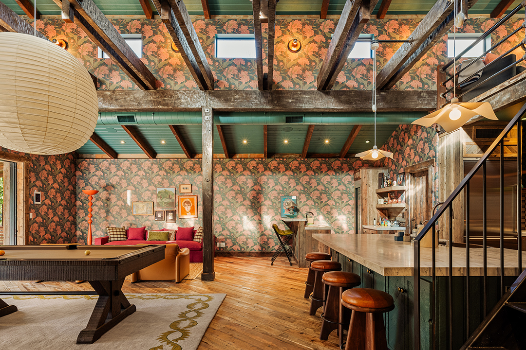 Wherever you are, the compound feels distinctly West Coast. The living room’s exposed beams, washed in a honey, almost apricot tone, lean into midcentury modern design, while walls clad in horizontal shiplap introduce a subtle coastal note. Patterned wallpapers, colorful tiles, and organic textures in the furniture inject a Palm Springs sort of playfulness. In the kitchen, rainbow onyx countertops continue the groovy vibes.