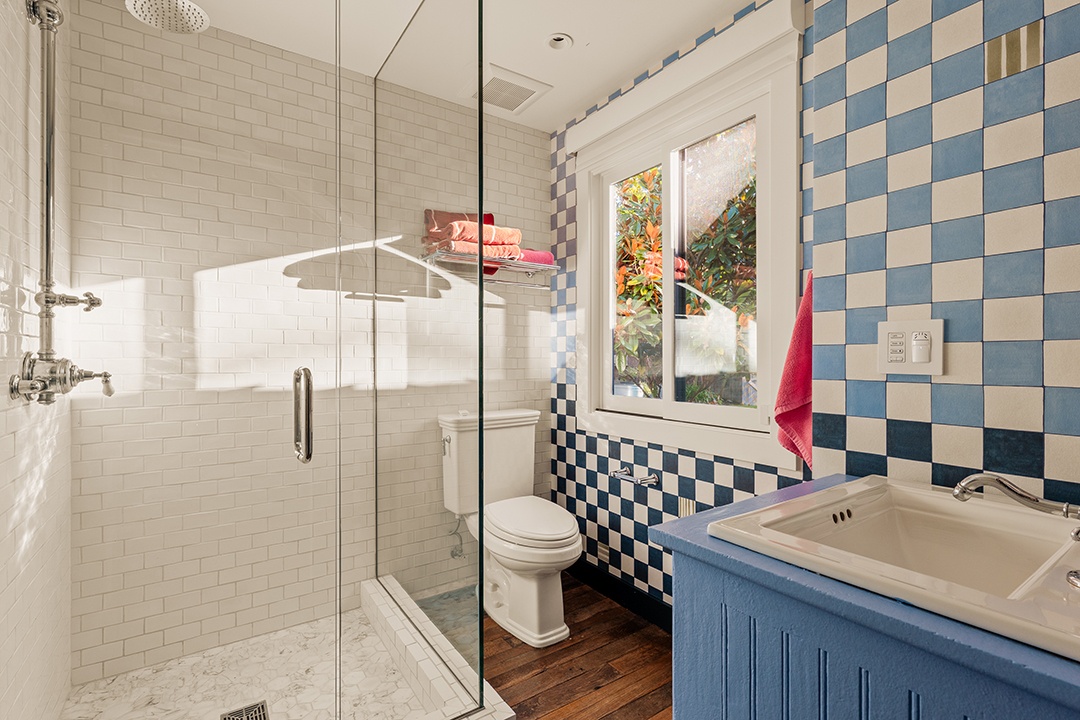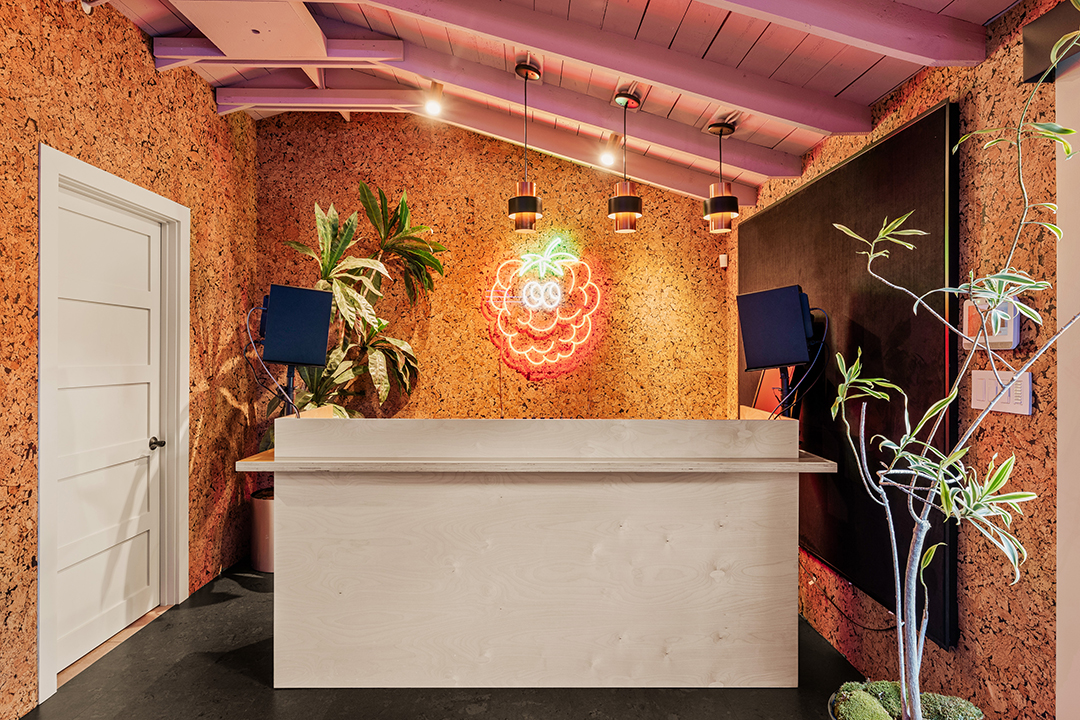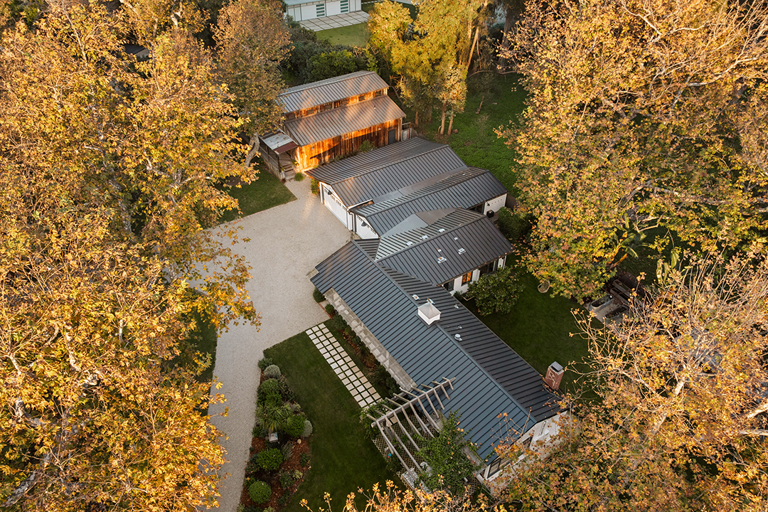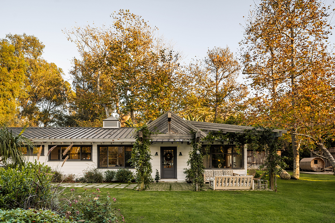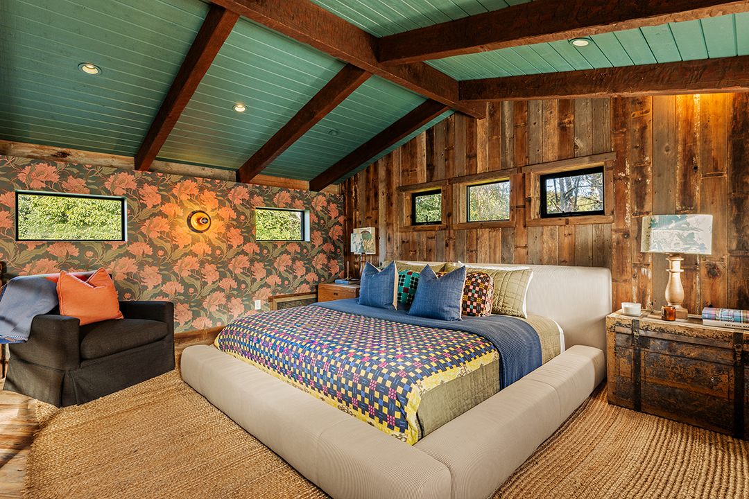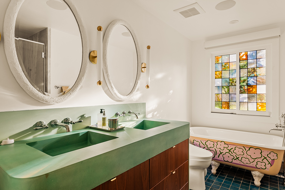 Wherever you are, the compound feels distinctly West Coast. The living room’s exposed beams, washed in a honey, almost apricot tone, lean into midcentury modern design, while walls clad in horizontal shiplap introduce a subtle coastal note. Patterned wallpapers, colorful tiles, and organic textures in the furniture inject a Palm Springs sort of playfulness. In the kitchen, rainbow onyx countertops continue the groovy vibes.