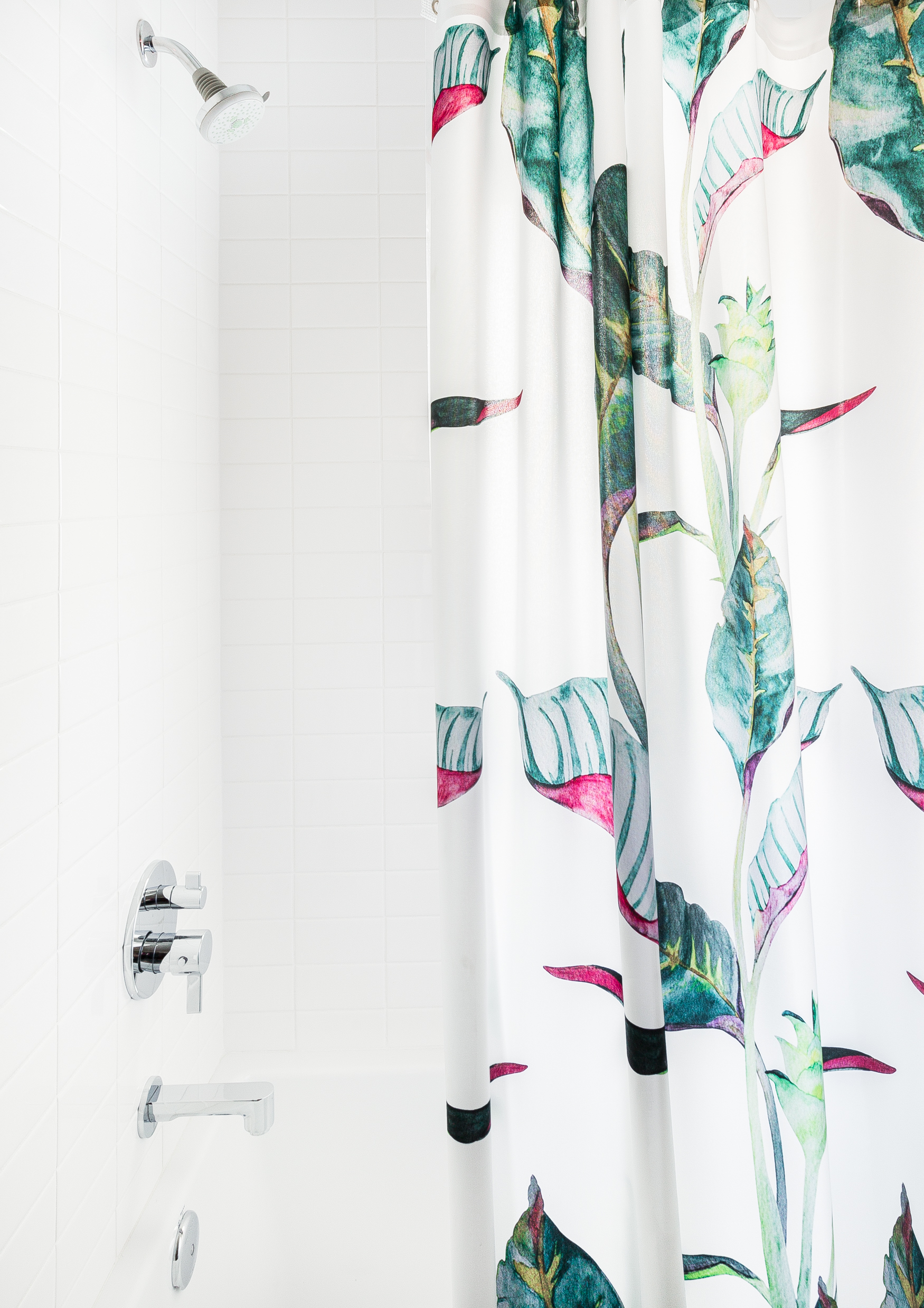 The colorful shower curtain in the children’s bath is from AllModern.