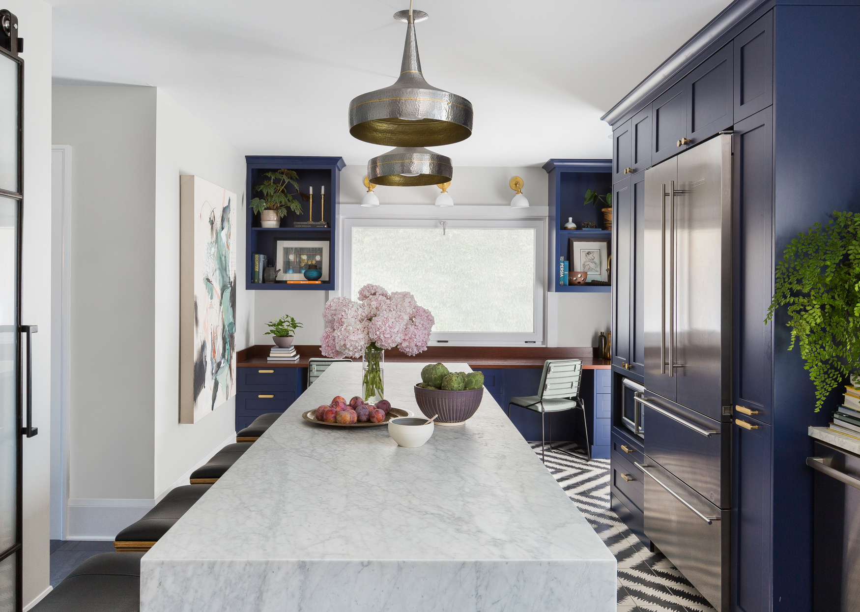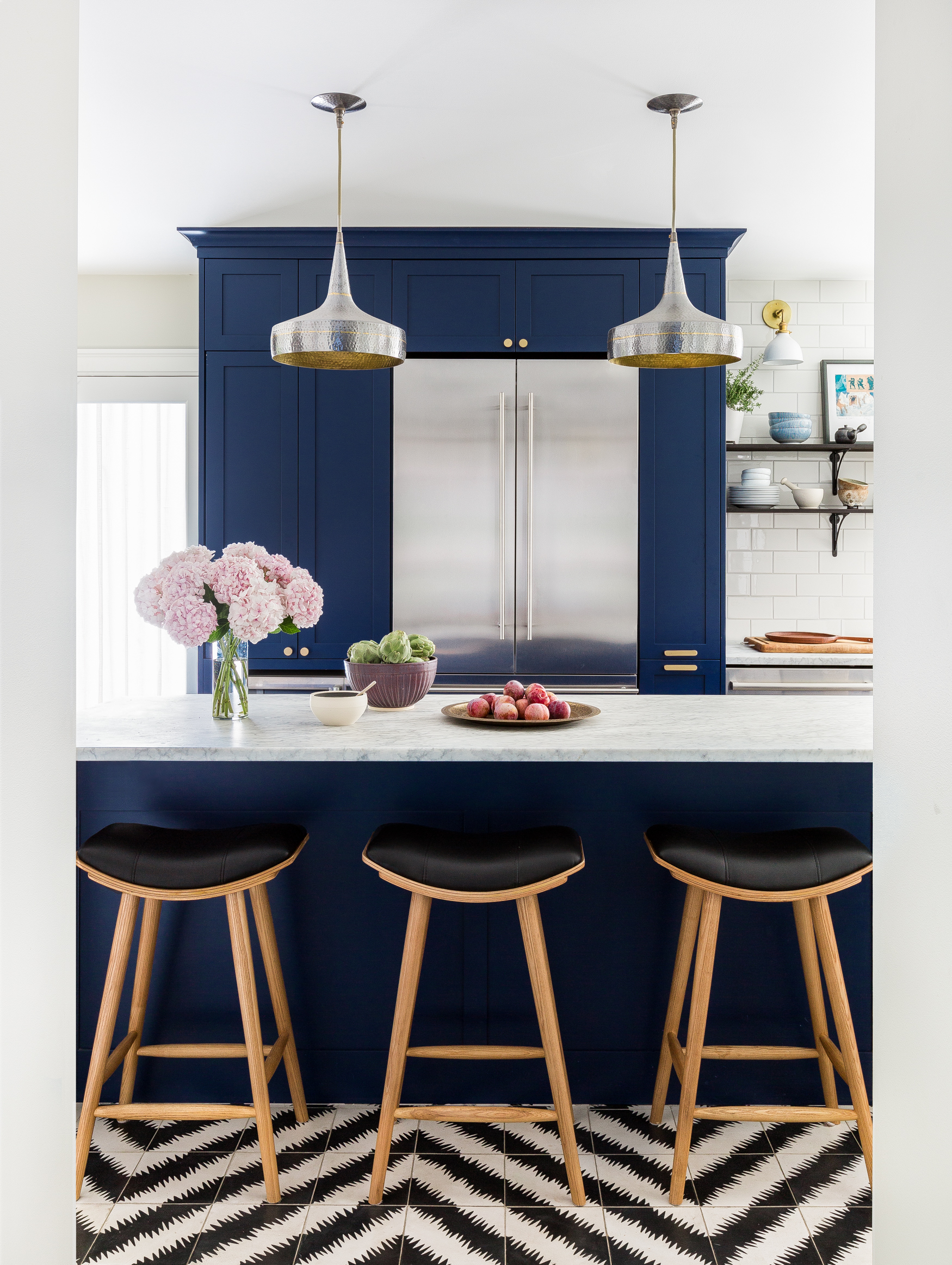 Chic navy cabinetry sets the tone for the kitchen, especially when paired with the Moroccan tile floor pattern from Ann Sacks and mixed metal accents. The subway tile of the backsplash is also from Ann Sacks. The cabinetry was designed by Kenna and built by J Wanamaker Cabinetry, a cabinet maker based in Seattle, while the cabinet hardware comes from Alno. Rejuvenation shelves display artful personal objects and a mélange of plants.