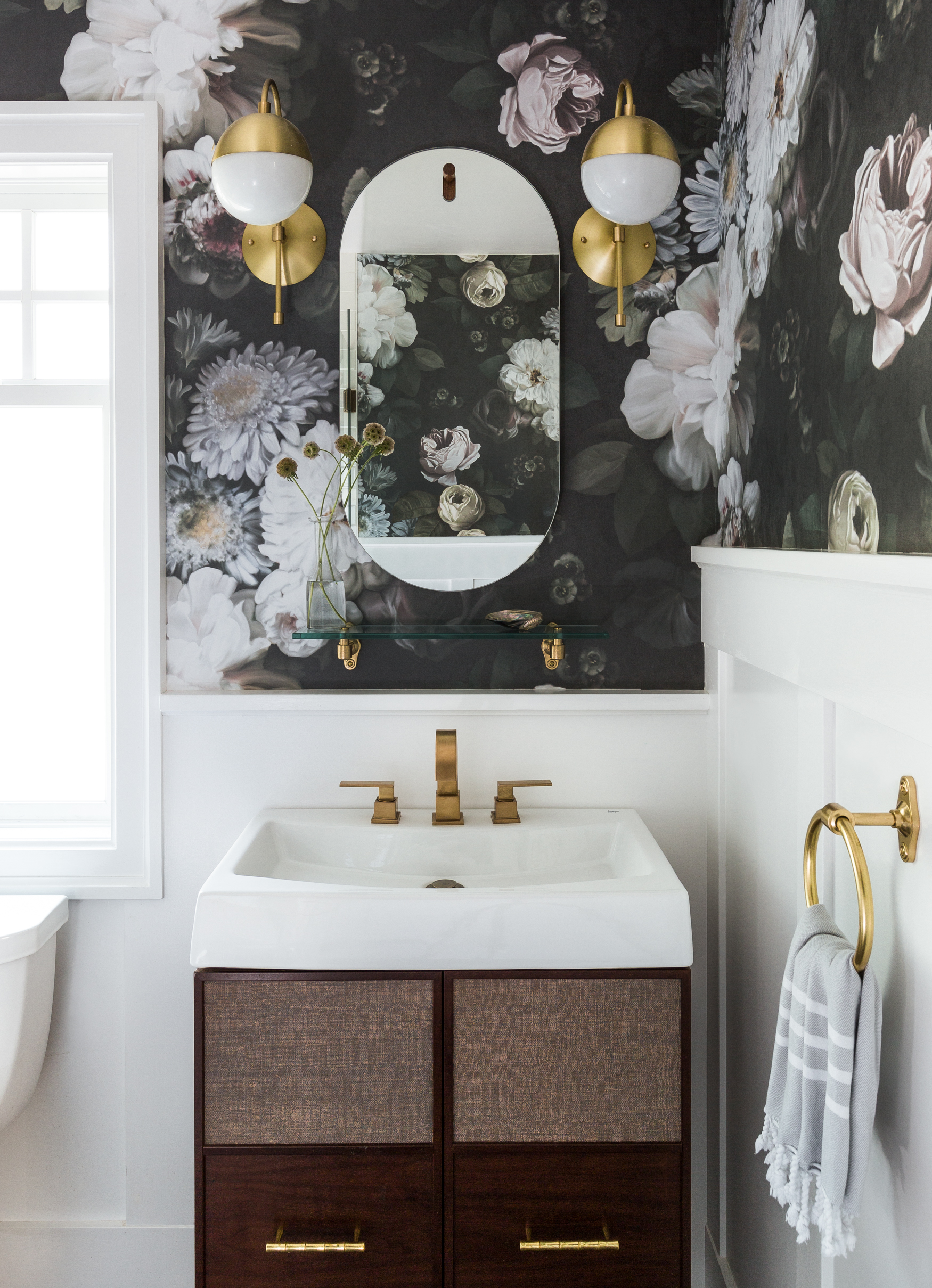 In the powder room, a dark floral wallpaper featuring painterly blooms is from Ellie Cashman Design. The custom vanity was built by J Wanamaker Cabinetry, and the mirror is from Blu Dot.