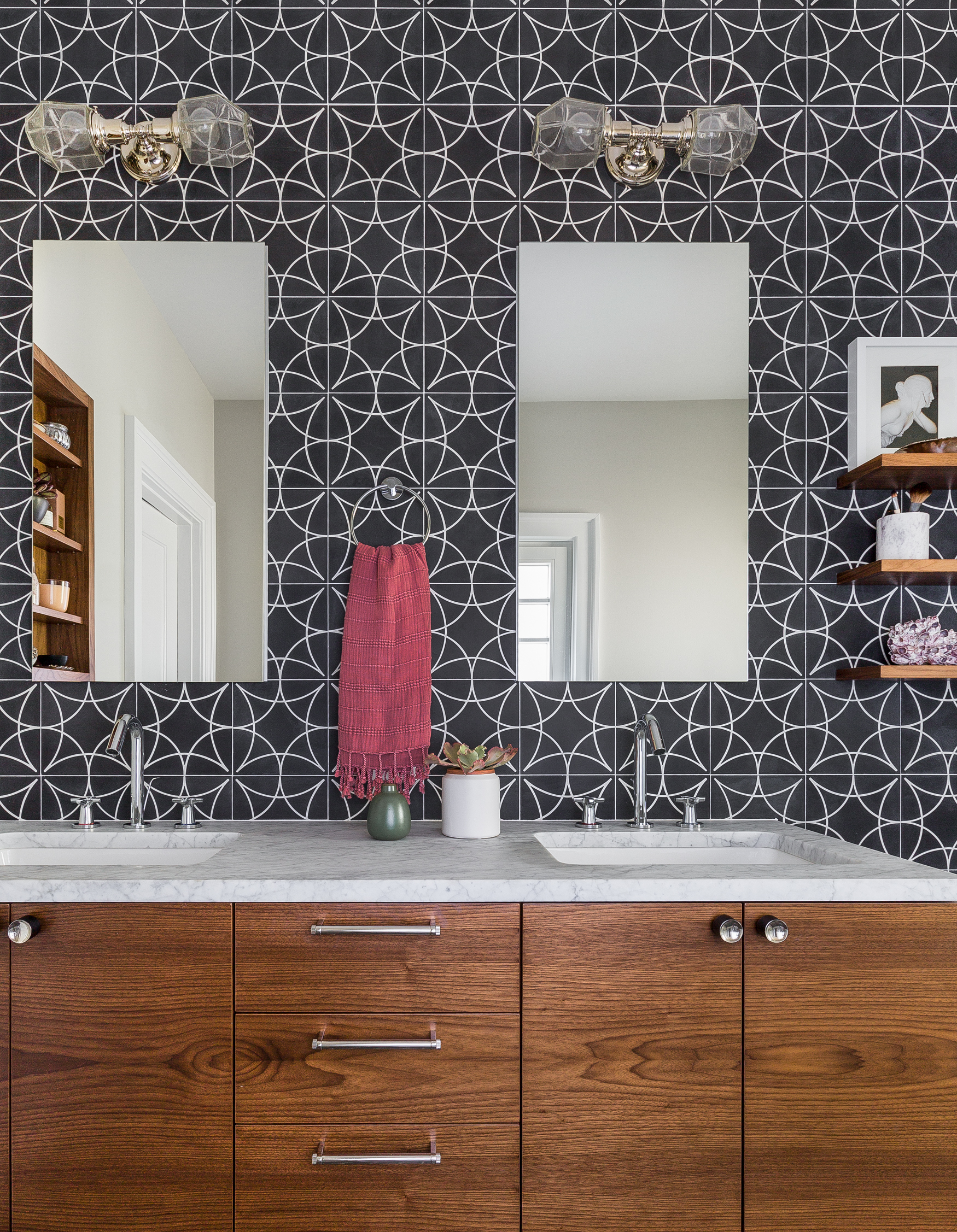 Clever geometric tile from Cement Tile Shop creates a playful atmosphere in the master bath. Medicine mirrors from GlassCrafters are simple and practical, in juxtaposition to the wall tile.