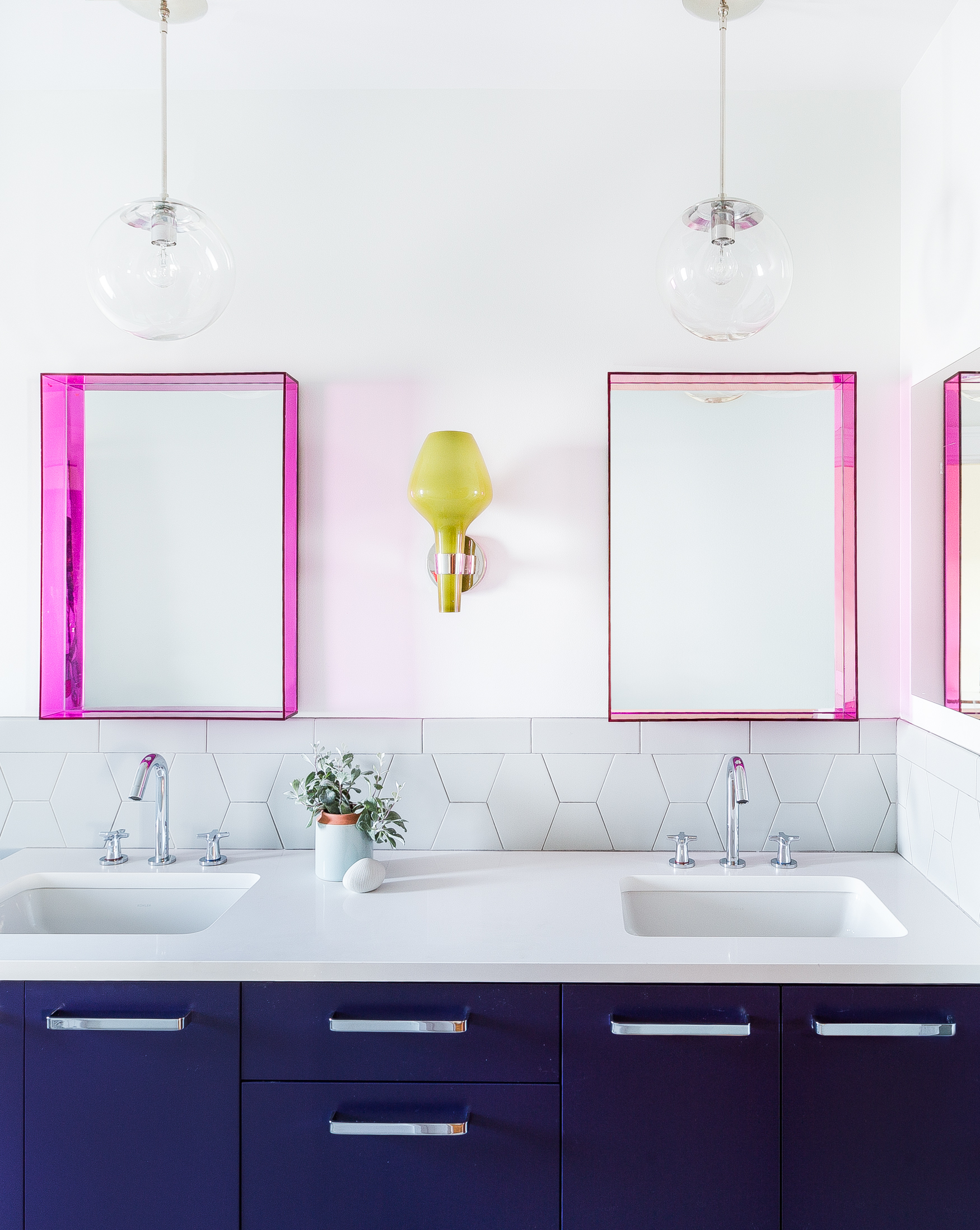 For the children’s bath, Kenna approached the space with a distinctly contemporary style. A transparent acrylic finish gives the Kartell mirrors a fluorescent pink glow, which stands out against the white backsplash from Daltile. The pendant lights above the mirrors are from Schoolhouse.