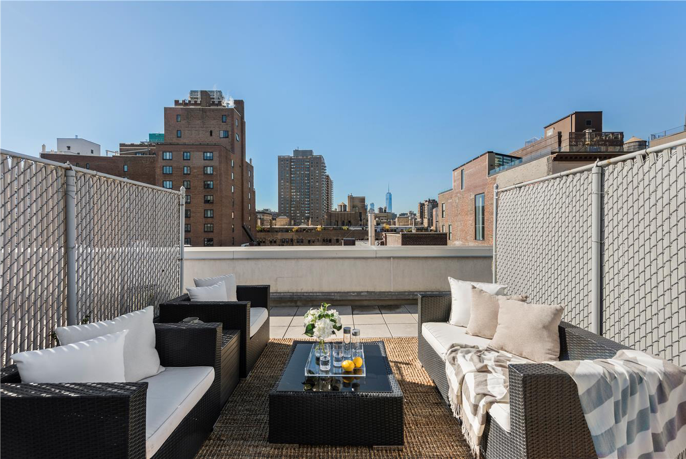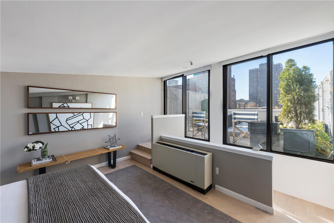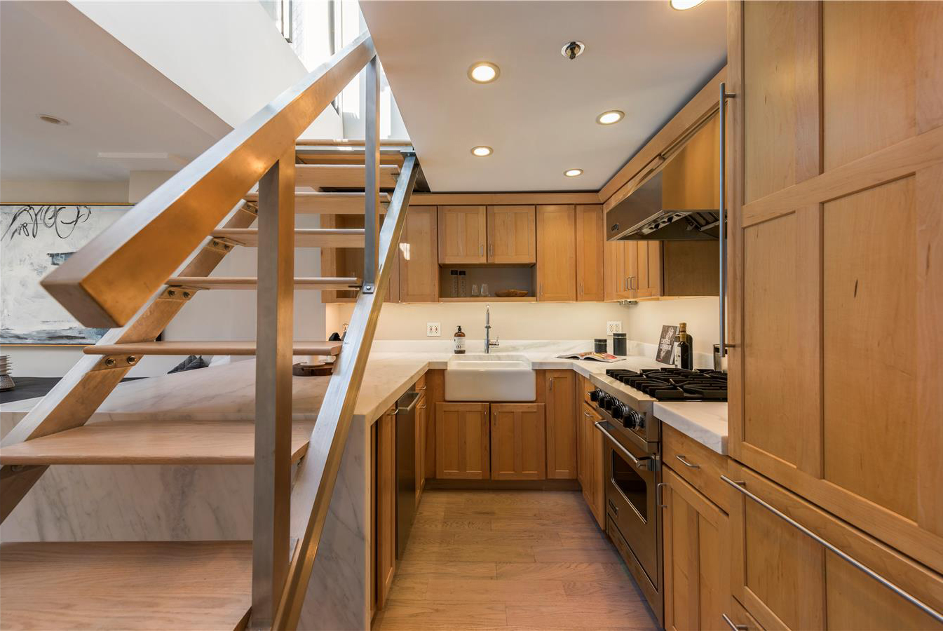 The unit is 750 square feet with an additional 330 square feet of private terrace space. Walls of windows plus a skylight make the entire space bright and sunny and the bathroom and kitchen have both been recently updated, the former featuring a herringbone marble floor and marble walls and the latter with SubZero and Viking appliances and Italian marble countertops. A unique floating staircase goes directly over the kitchen counters and leads to the upstairs living space, where the bedroom suite is located.