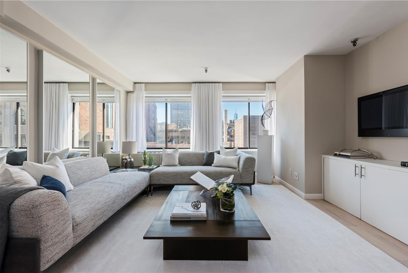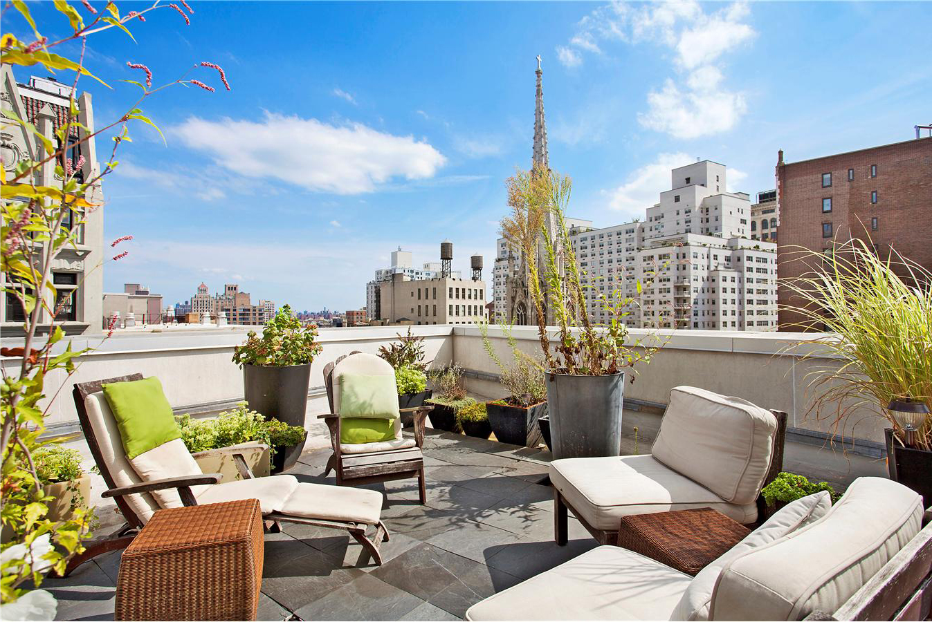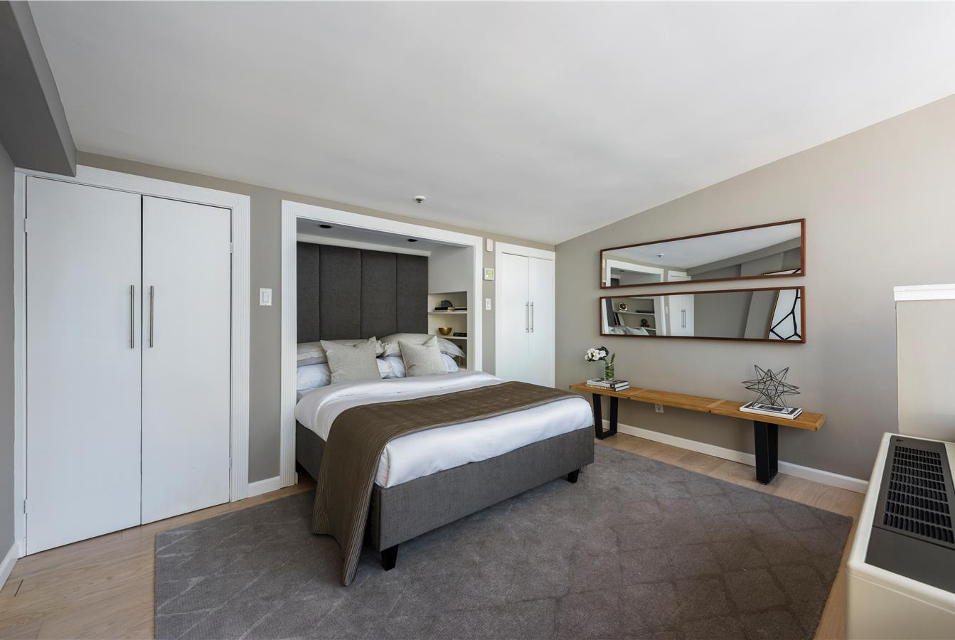 The unit is 750 square feet with an additional 330 square feet of private terrace space. Walls of windows plus a skylight make the entire space bright and sunny and the bathroom and kitchen have both been recently updated, the former featuring a herringbone marble floor and marble walls and the latter with SubZero and Viking appliances and Italian marble countertops. A unique floating staircase goes directly over the kitchen counters and leads to the upstairs living space, where the bedroom suite is located.