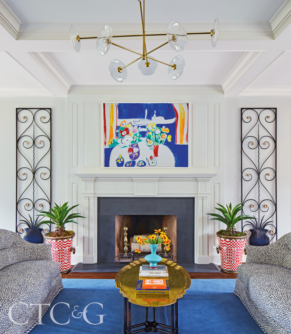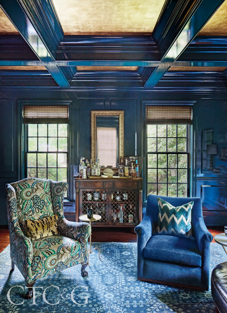 Indeed, each of the vibrant hues on the canvases appears in the house, the most striking example being the moody blues that envelop the den, a cozy space the homeowner cites as her and her husband’s favorite—while Banks and Smith call it the “sexy den,” a reference they coined for the best room in the house to retreat to for a drink by the fire. To further imbue the room with a signature element, the designers commissioned a painter to add gold-leaf to portions of the coffered ceiling.
