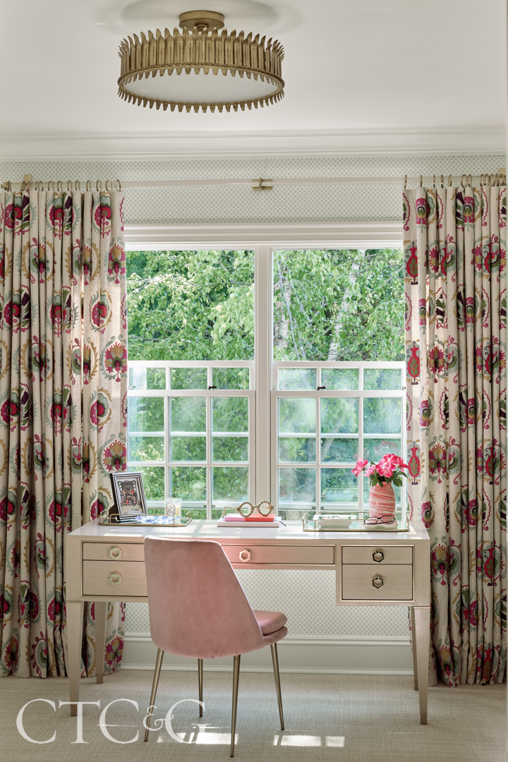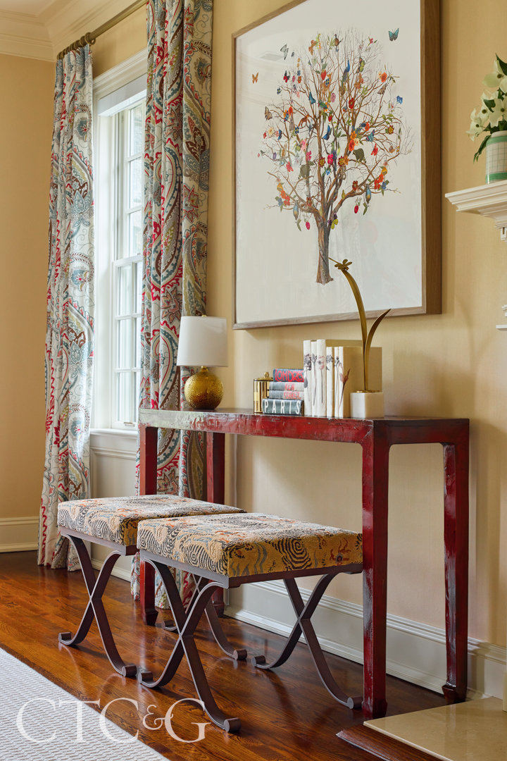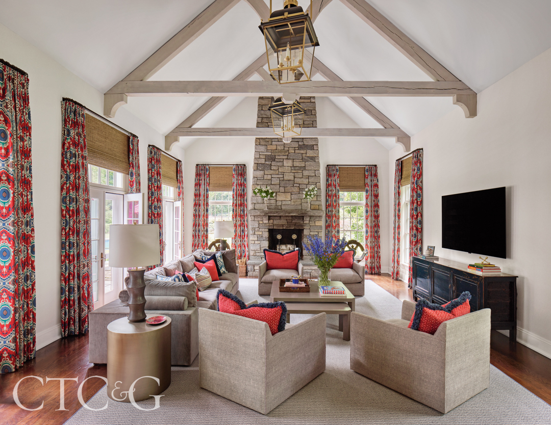 The homeowner cites red as her favorite color (“Is it because I was born on Valentine’s Day?” she suggests rhetorically) to which Banks and Smith responded by infusing the family room with red-patterned draperies fashioned from a Schumacher pattern discovered by their project manager, David Leblanc. The repeating rhythm of the material—from window to window—assumes a striking effect against white-washed beams. Four swivel chairs sport red throw pillows trimmed in a moss fringe—“a detail that takes that room from 30 to a 100 in 10 seconds,” notes Smith.