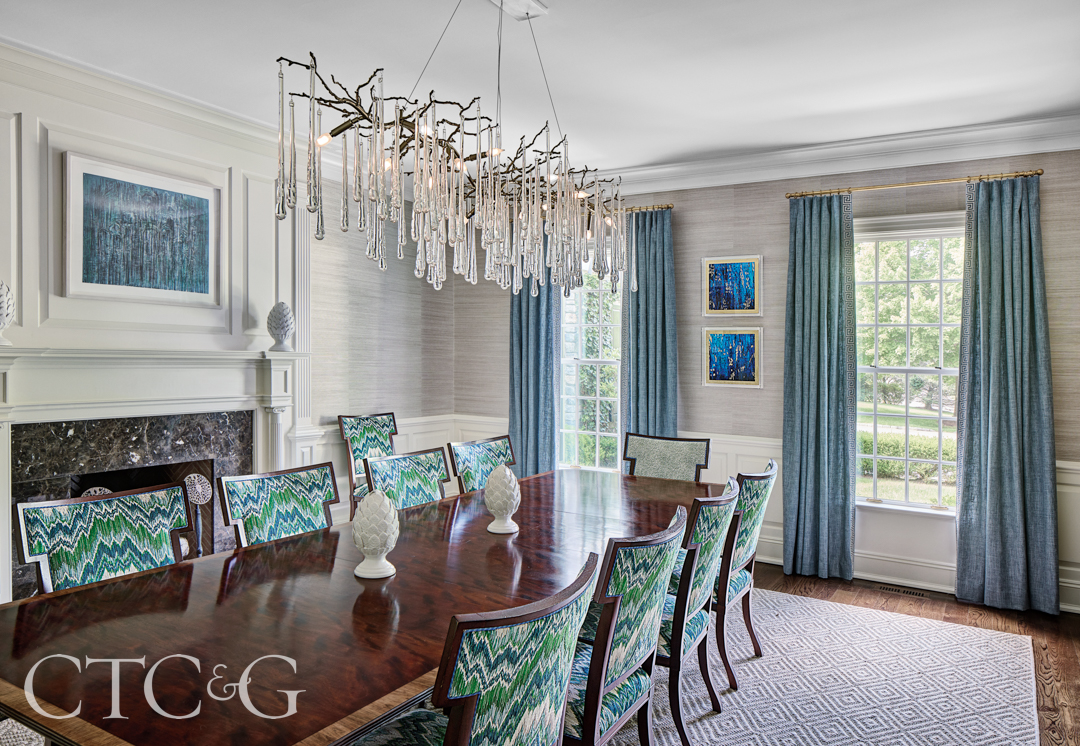 A set of vintage Hickory dining chairs found by the design team were reupholstered in a green-blue Schumacher fabric, the ensemble of which assumes a special presence when the room’s crystal chandelier is illuminated. Each of the glass elements replicates either droplets of water, according to Banks and Smith, or icicles, according to the homeowner. “It took seven months to find the right chandelier,” recounts Nemser, “but it was worth the hunt because it’s such a fun element.”
