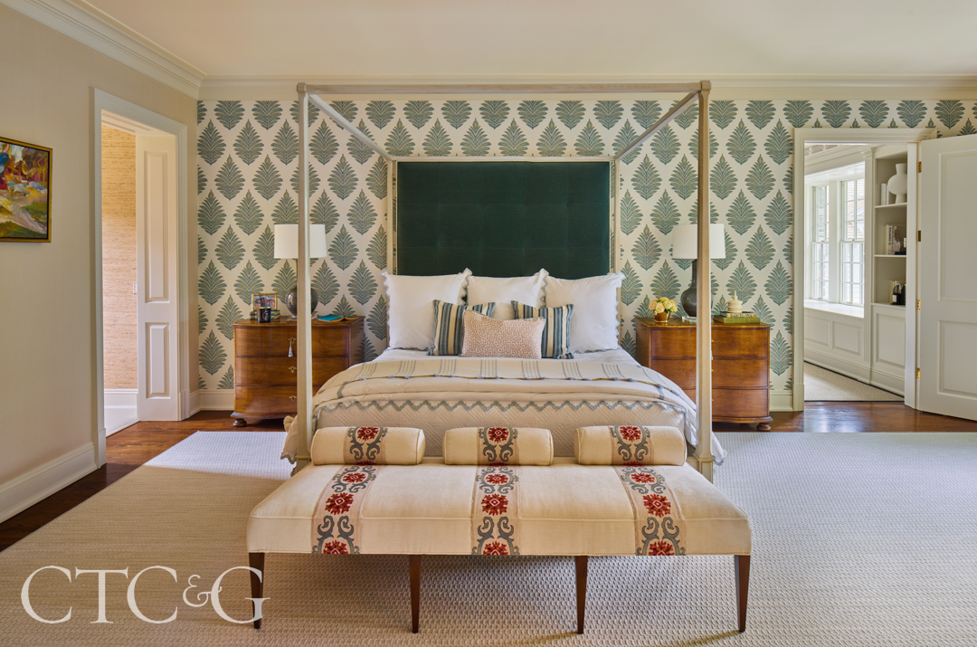 A Hickory Chair bed in the primary suite features a tall all-mohair headboard. A Vanguard bench is accented with a Colefax & Fowler embroidered trim. Side tables are from Holland MacRae, and an Anna French botanical-themed paper enlivens the walls.
